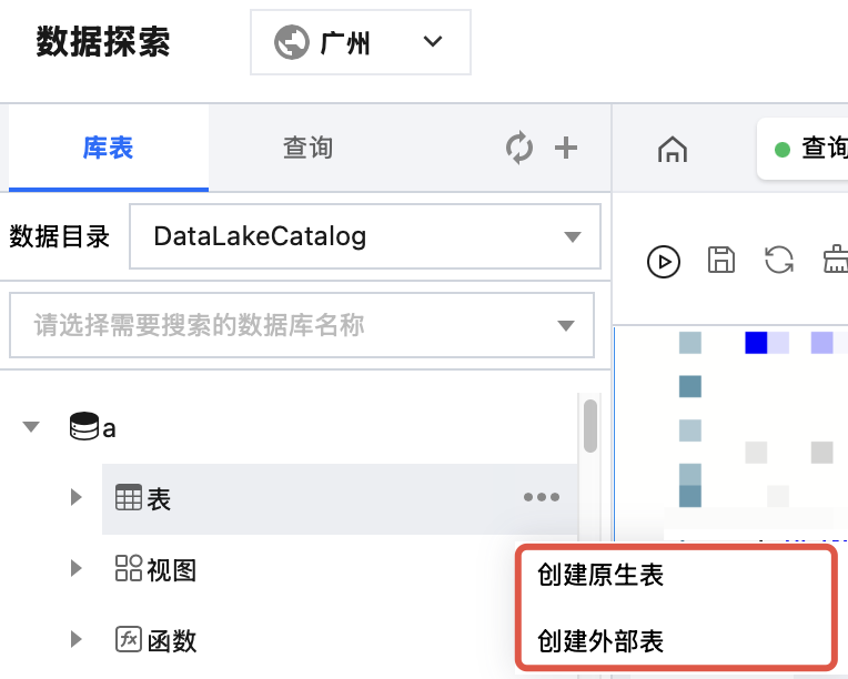 2. 进入 数据探索 模块,在左侧列表中,单击已有数据库,鼠标悬停表行,然后单击图标,单击 创建原生表 或者 创建外部表。 说明: