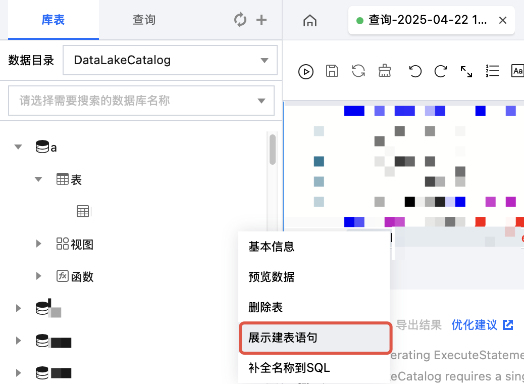 在数据表项目中,鼠标悬停数据表名称行,然后单击图标,在下拉菜单中单击展示建表语句,DLC 会自动生成查看该数据表的建表语句,执行 SQL 语句查询建表语句。 系统约束