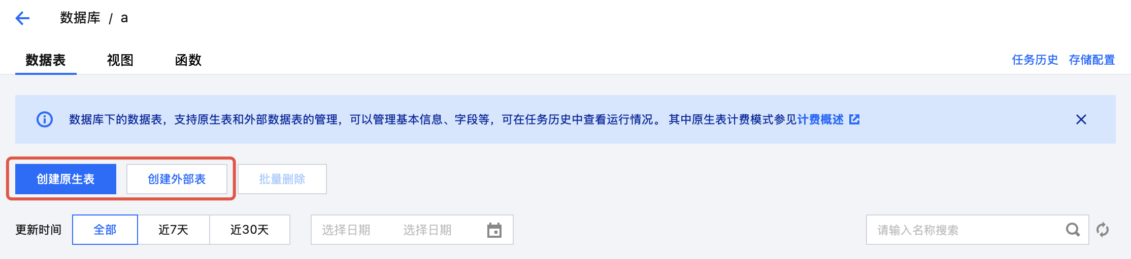 数据管理模块支持管理托管存储于 DLC 的原生表及外部表。