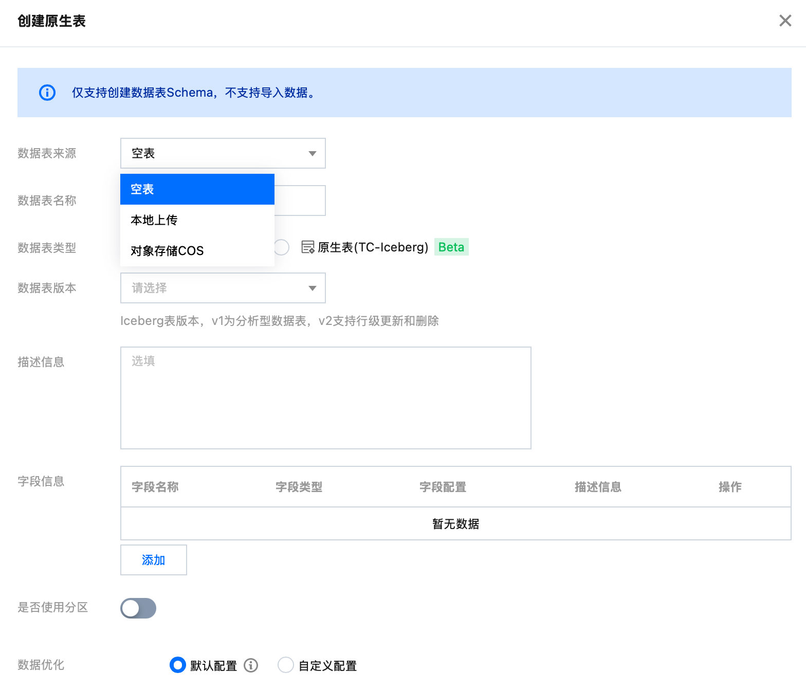 4. 原生表数据来源支持空表、本地上传、对象存储 COS 三种不同类型,选择不同数据来源对应不同的创建流程。原生表支持数据优化等能力,可以选择继承库治理规则或单独启闭。