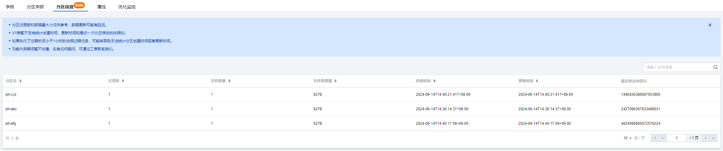 数据表管理支持查询数据表的分区相关信息,通过分区信息,用户可以查看表各个分区的记录数、文件数量、数据存储量及更新时间等信息。