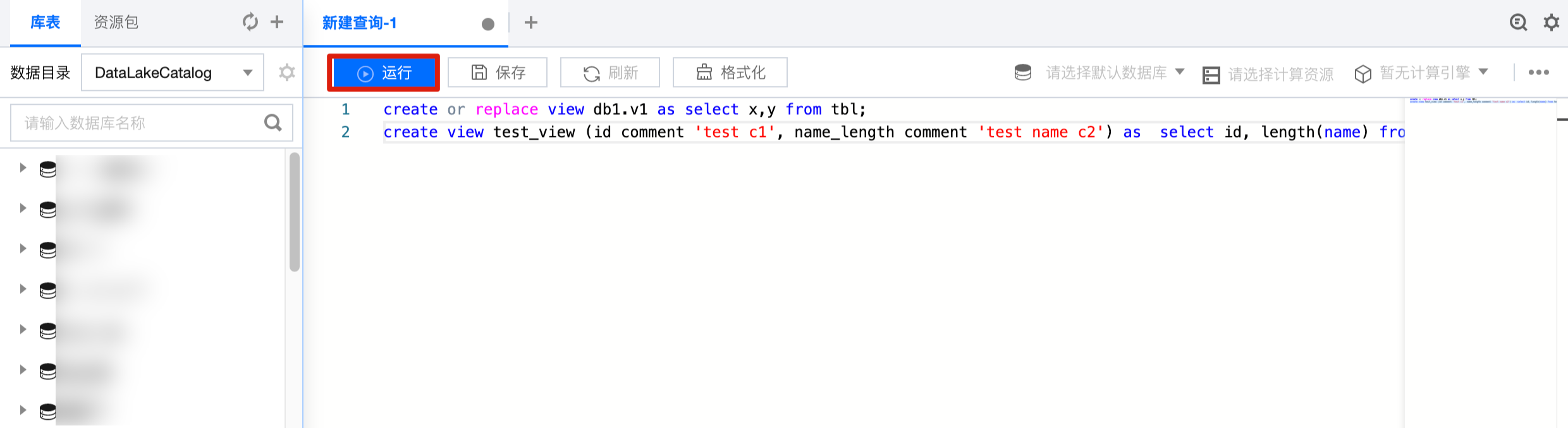 2. 进入数据探索页,通过 SQL 语句即可创建视图,语句详情参见 SQL 语法。 3. 选择计算资源,单击运行按钮之后即可完成视图创建。