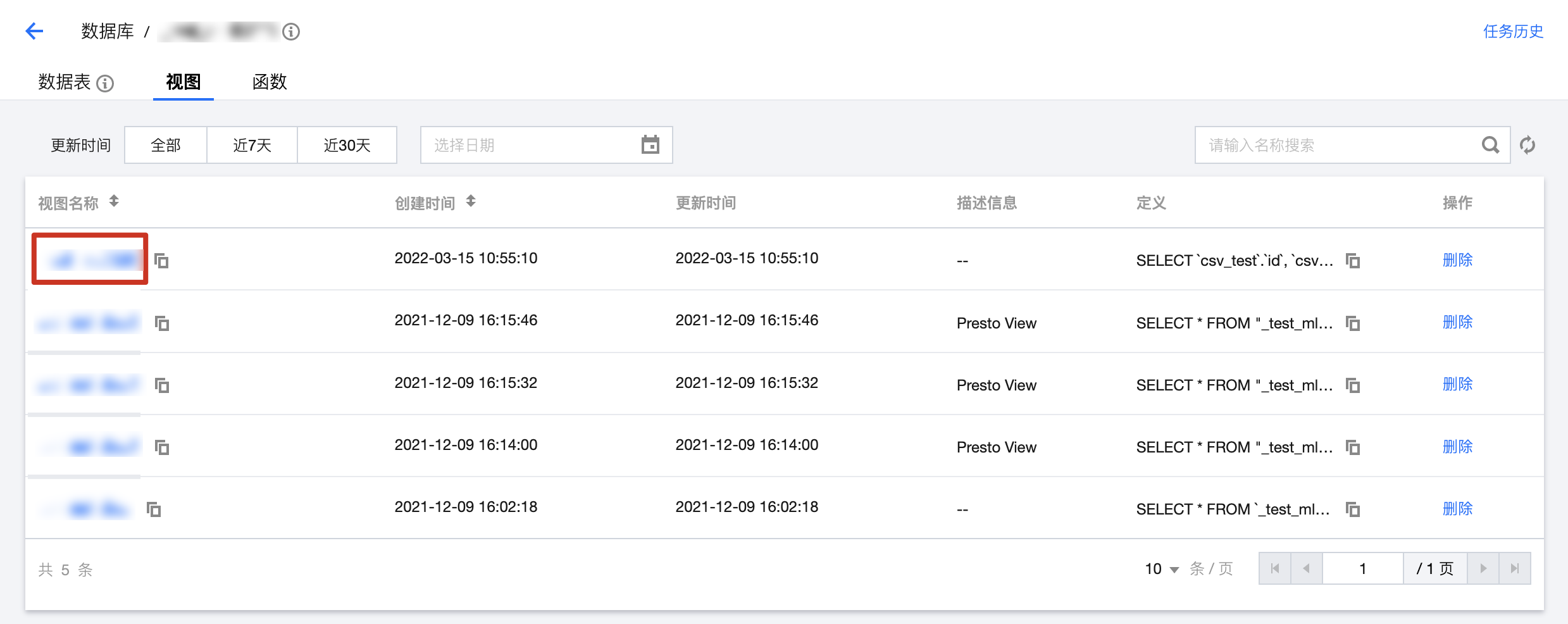 您可以通过数据探索使用 SQL 语句对视图进行查看,具体语法参见 SQL 语法。同时数据湖计算 DLC 也提供了可视化界面对视图进行管理,操作如下。 2. 进入数据管理页,单击视图所在的数据库名称进入数据库管理页。