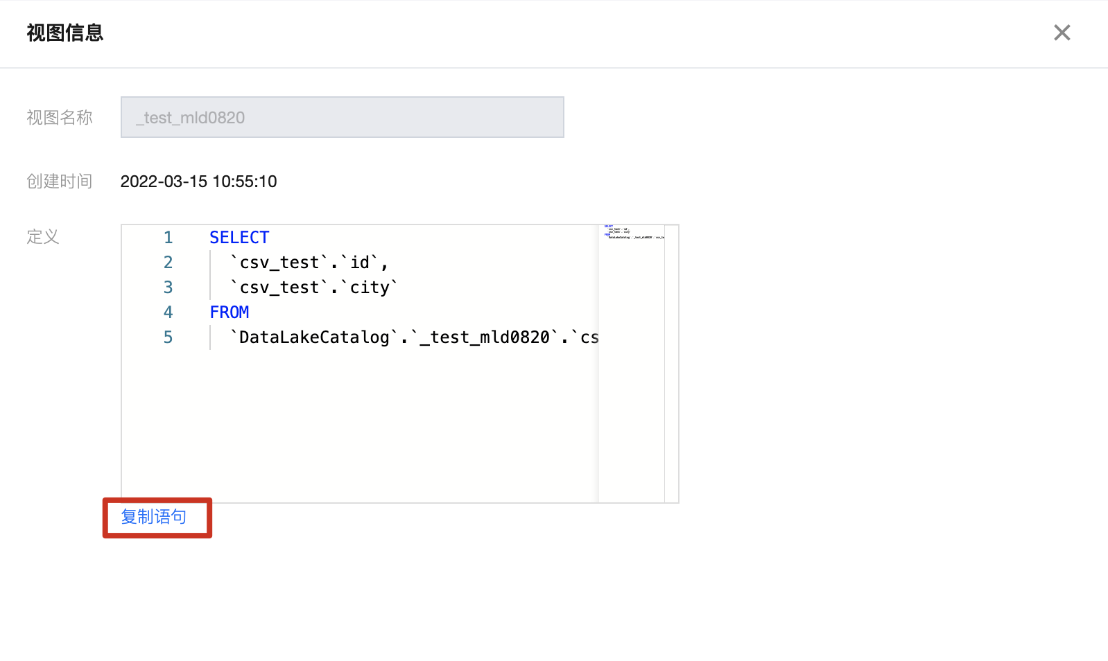 4. 单击需要查看的视图名称,即可查看视图信息,可对 SQL 语句进行复制操作。