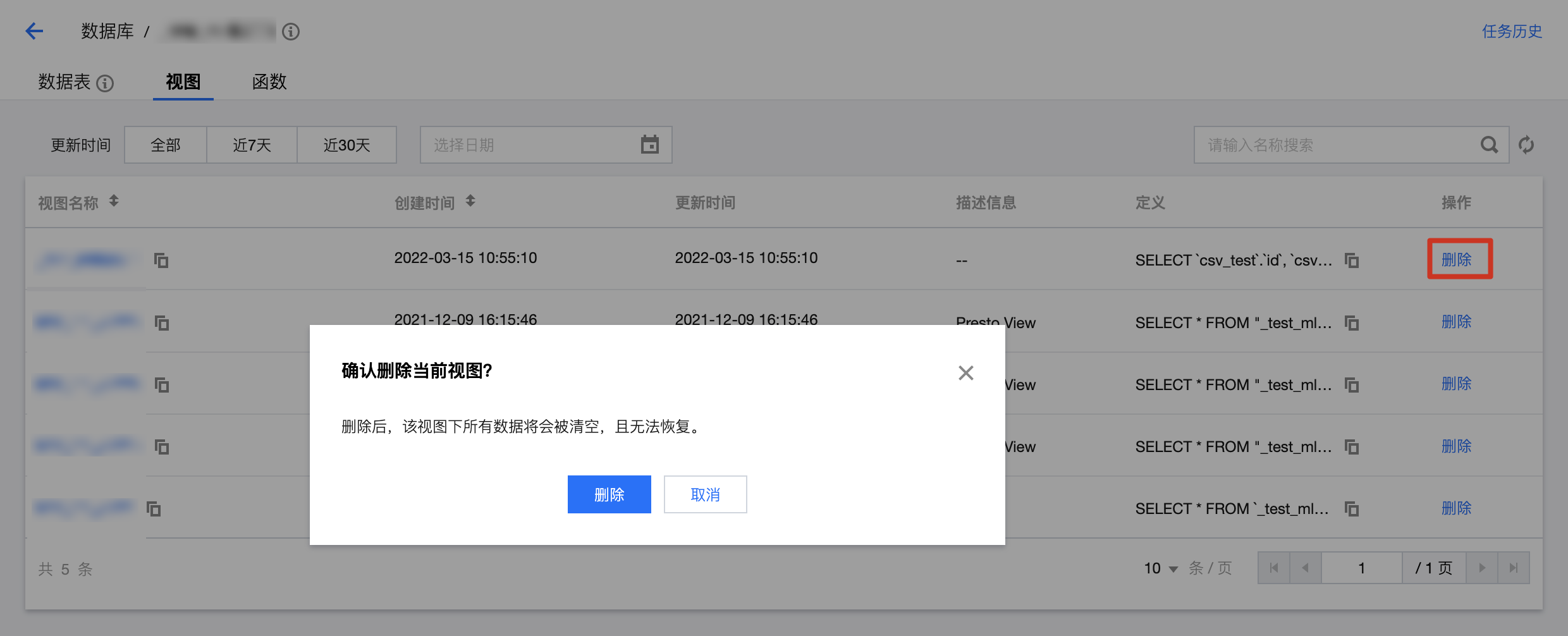删除视图将清空视图下的所有数据,且无法恢复,请谨慎操作。