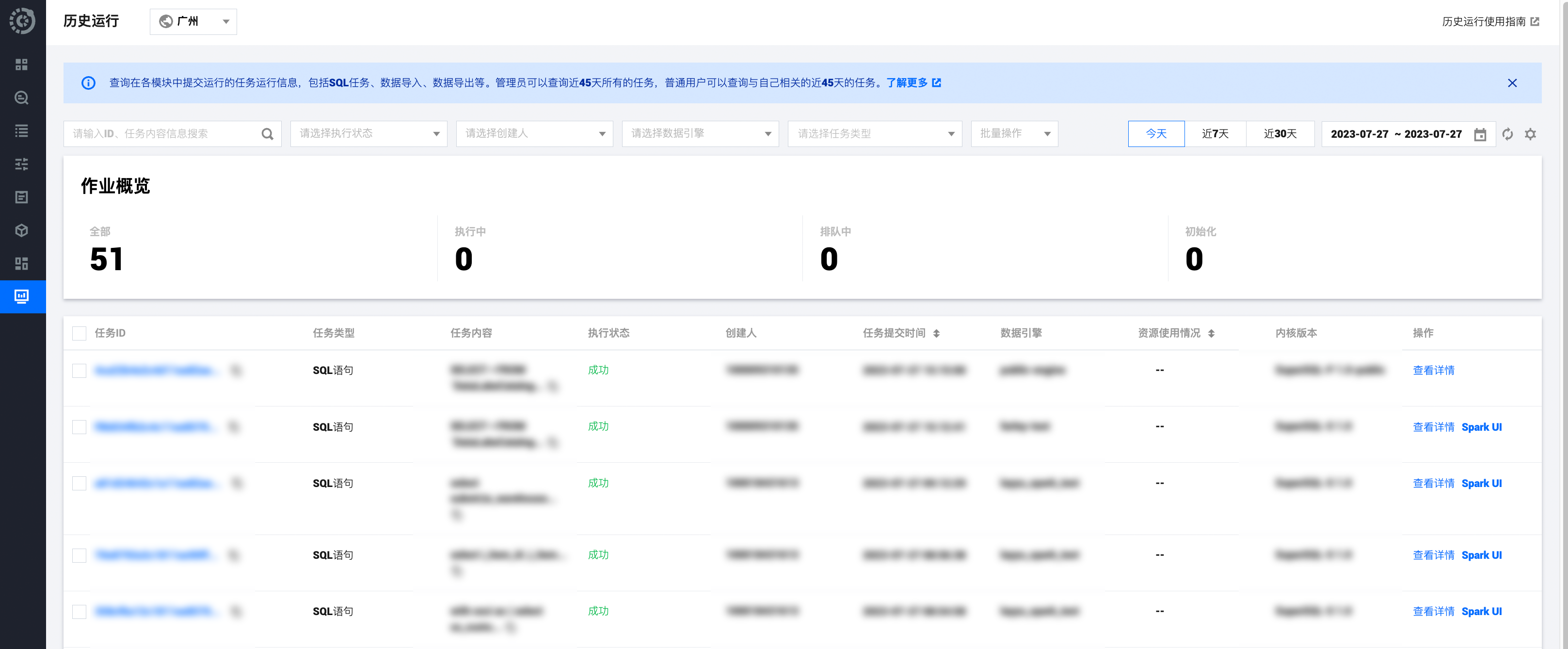 2. 进入历史运行页面,管理员可查看近45天所有的历史运行任务,普通用户可查询与自己相关的近45天的任务。