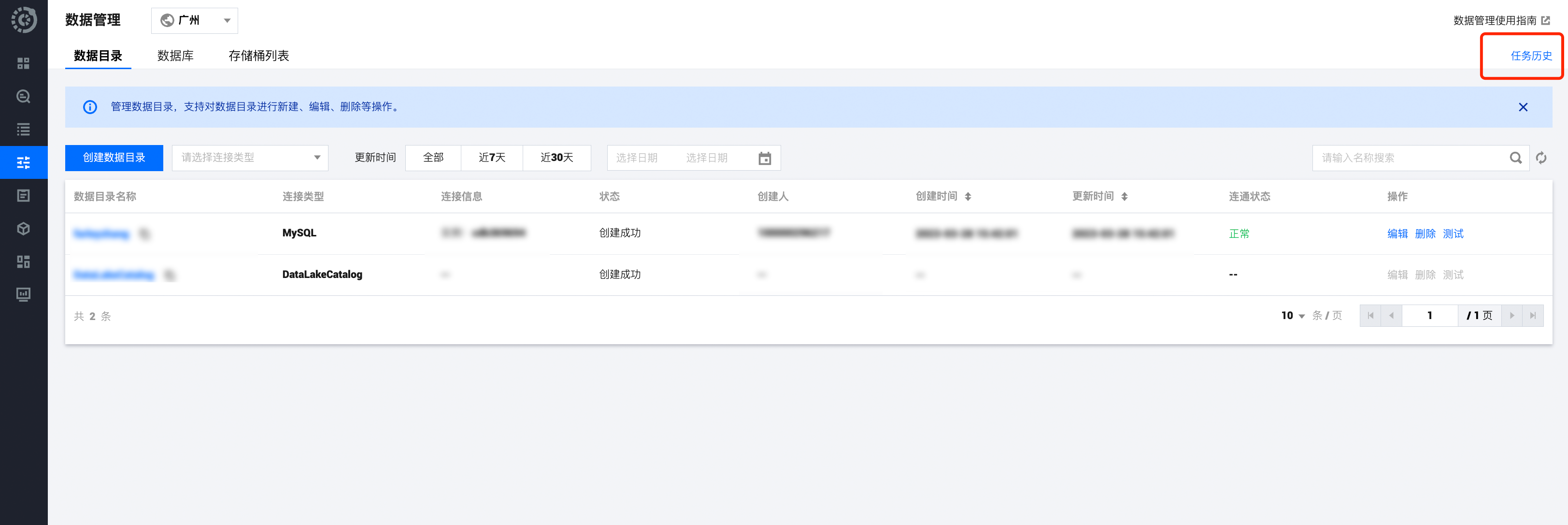 2. 单击右上角的任务历史即可查询数据导入历史任务。