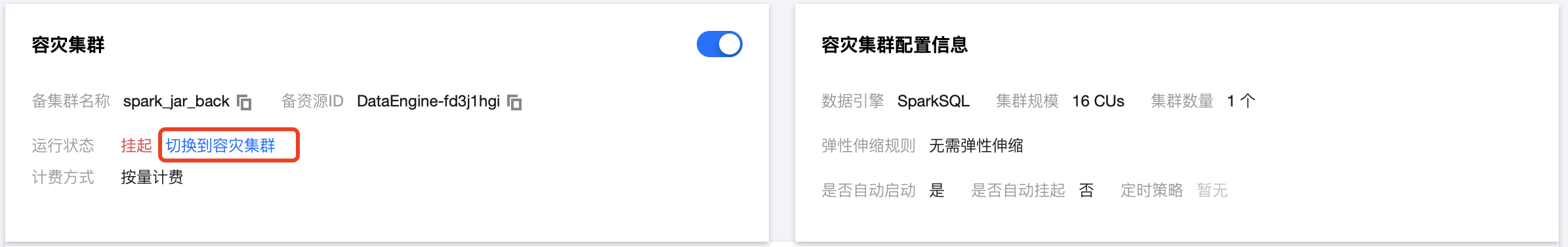 1. 当 SuperSQL 引擎本身为包年包月的16 CU SparkSQL引擎时。开启容灾集群后,容灾集群为按量计费的16 CU SparkSQL引擎,此时容灾集群挂起不收费。当用户切换到容灾集群后,容灾集群运行,将额外收取容灾集群使用 CU 时长的费用。具体费用可参考计费概述。 2. 当 SuperSQL 引擎本身为按量计费的16 CU SparkSQL 引擎时。开启容灾集群后,容灾集群为按量计费的16 CU SparkSQL 引擎,此时容灾集群挂起不收费。当用户切换到容灾集群后,容灾集群运行,主集群挂起,只收取容灾集群使用 CU 时长的费用。