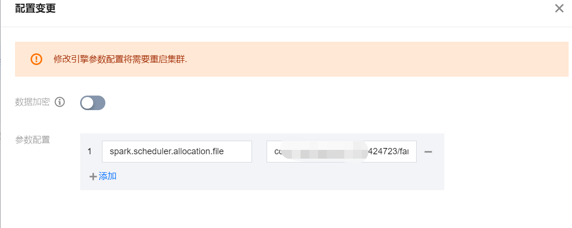 参数配置 spark.scheduler.allocation.file,取值为您的调度池 xml 文件路径 cosn://bucket-appid/fairscheduler.xml。