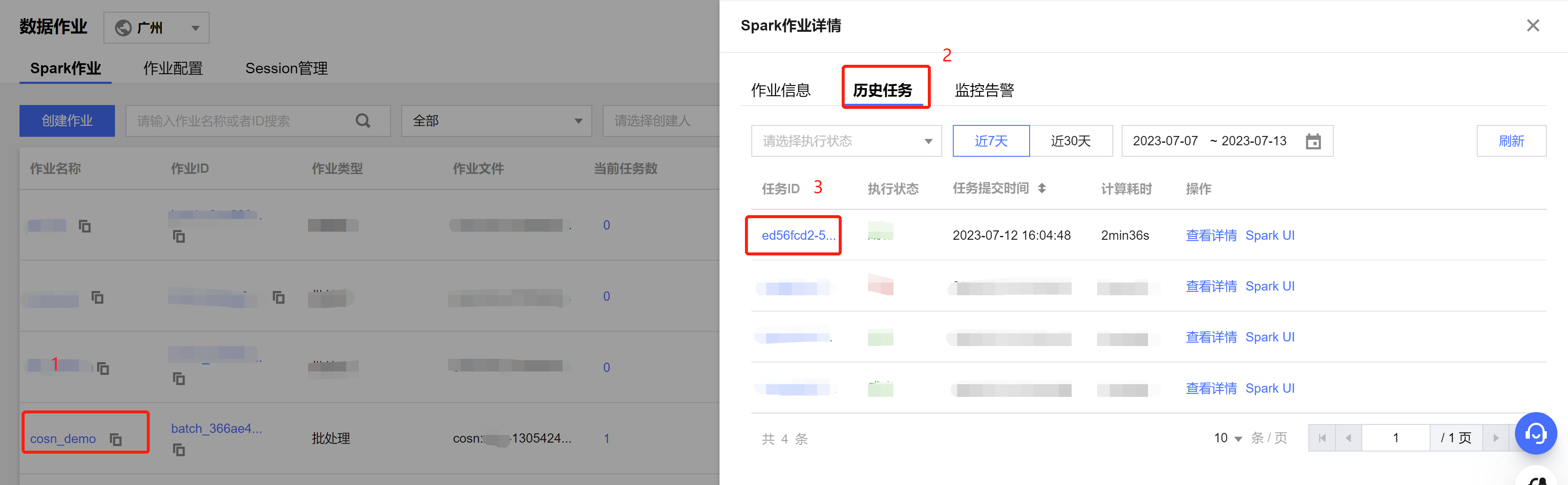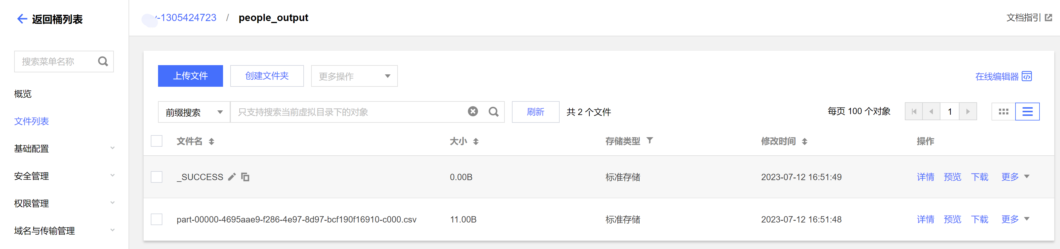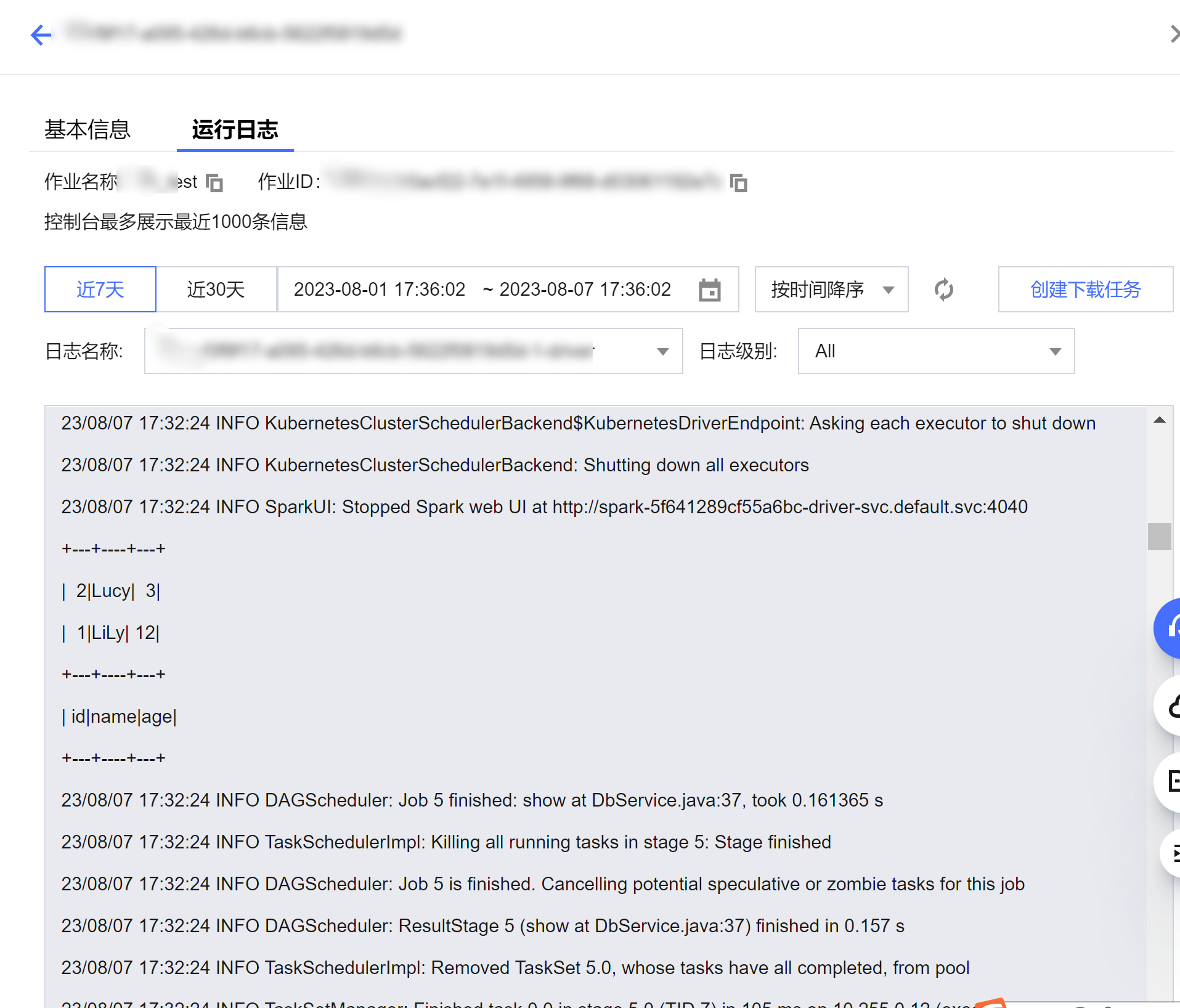 package com.tencent.dlc;import org.apache.spark.sql.Dataset;import org.apache.spark.sql.Row;import org.apache.spark.sql.SaveMode;import org.apache.spark.sql.SparkSession;public class CosService {public static void main( String[] args ){//1.创建SparkSessionSparkSession spark = SparkSession.builder().appName("Operate data on cos").config("spark.some.config.option", "some-value").getOrCreate();//2.读取cos上的json文件生成数据集,支持多种类型的文件,如 json,csv,parquet,orc,textString readPath = "cosn://dlc-demo-1305424723/people.json";Dataset<Row> readData = spark.read().json(readPath);//3.对数据集做业务计算操作生成结果数据,计算支持API和SQL形式,这里生成临时表用sql读数据readData.createOrReplaceTempView("people");Dataset<Row> result = spark.sql("SELECT * FROM people where age > 3");//4.结果数据保存到cosString writePath = "cosn://dlc-demo-1305424723/people_output";//写入支持多种类型的文件,如 json,csv,parquet,orc,textresult.write().mode(SaveMode.Append).json(writePath);spark.read().json(writePath).show();//5.关闭sessionspark.stop();}}