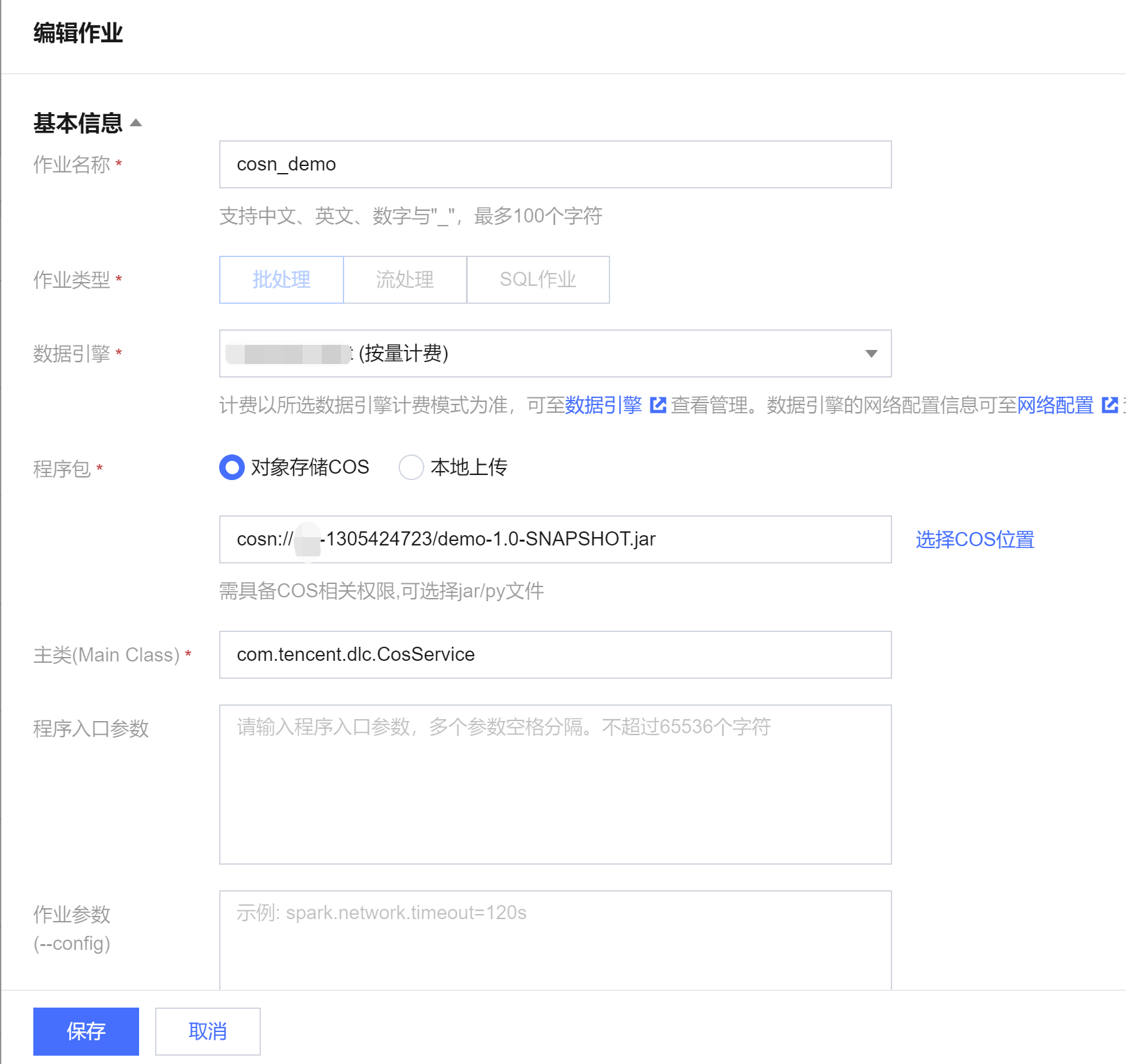 作业名称 | 自定义 Spark Jar 作业名称,例如:cosn-demo |