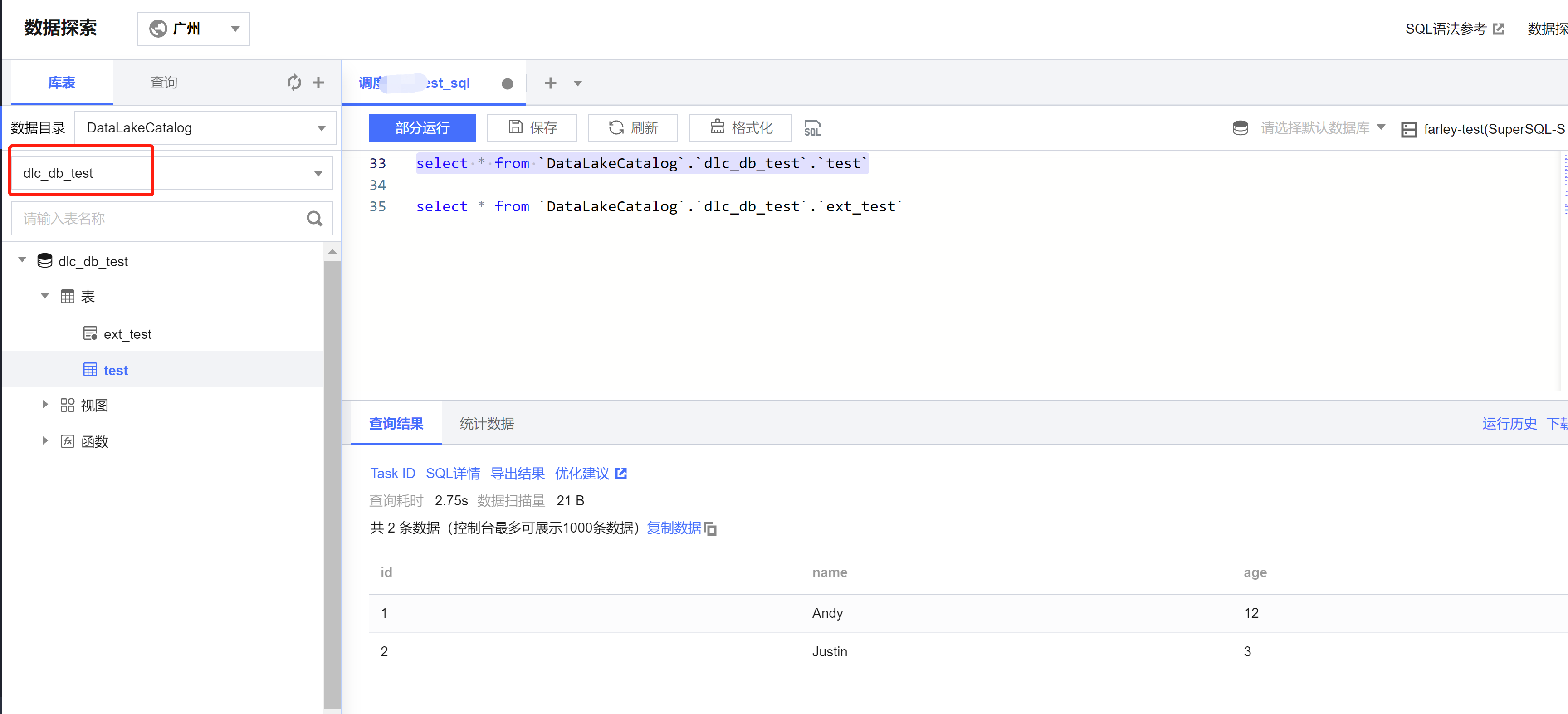 package com.tencent.dlc;import org.apache.spark.sql.SparkSession;public class DbService {public static void main(String[] args) {//1.初始化SparkSessionSparkSession spark = SparkSession.builder().appName("Operate DB Example").getOrCreate();//2.建数据库String dbName = " `DataLakeCatalog`.`dlc_db_test` ";String dbSql = "CREATE DATABASE IF NOT EXISTS" + dbName + " COMMENT 'demo test'";spark.sql(dbSql);//3.建内表String tableName = "`test`";String tableSql = "CREATE TABLE IF NOT EXISTS " + dbName + "." + tableName+ "(`id` int,`name` string, `age` int)";spark.sql(tableSql);//4.写数据spark.sql("INSERT INTO " + dbName + "." + tableName + "VALUES (1,'Andy',12),(2,'Justin',3) ");//5.查询数据spark.sql(" SELECT * FROM " + dbName + "." + tableName).show();//6.建外表String extTableName = "`ext_test`";spark.sql("CREATE EXTERNAL TABLE IF NOT EXISTS " + dbName + "." + extTableName + ""+ " (`id` int, `name` string, `age` int) "+ "ROW FORMAT SERDE 'org.apache.hive.hcatalog.data.JsonSerDe' "+ "STORED AS TEXTFILE LOCATION 'cosn://dlc-demo-1305424723/ext_test '");//7.写外表数据spark.sql("INSERT INTO " + dbName + "." + extTableName + "VALUES (1,'LiLy',12),(2,'Lucy',3) ");//8.查询外表数据spark.sql(" SELECT * FROM " + dbName + "." + extTableName).show();//9.关闭Sessionspark.stop();}}
