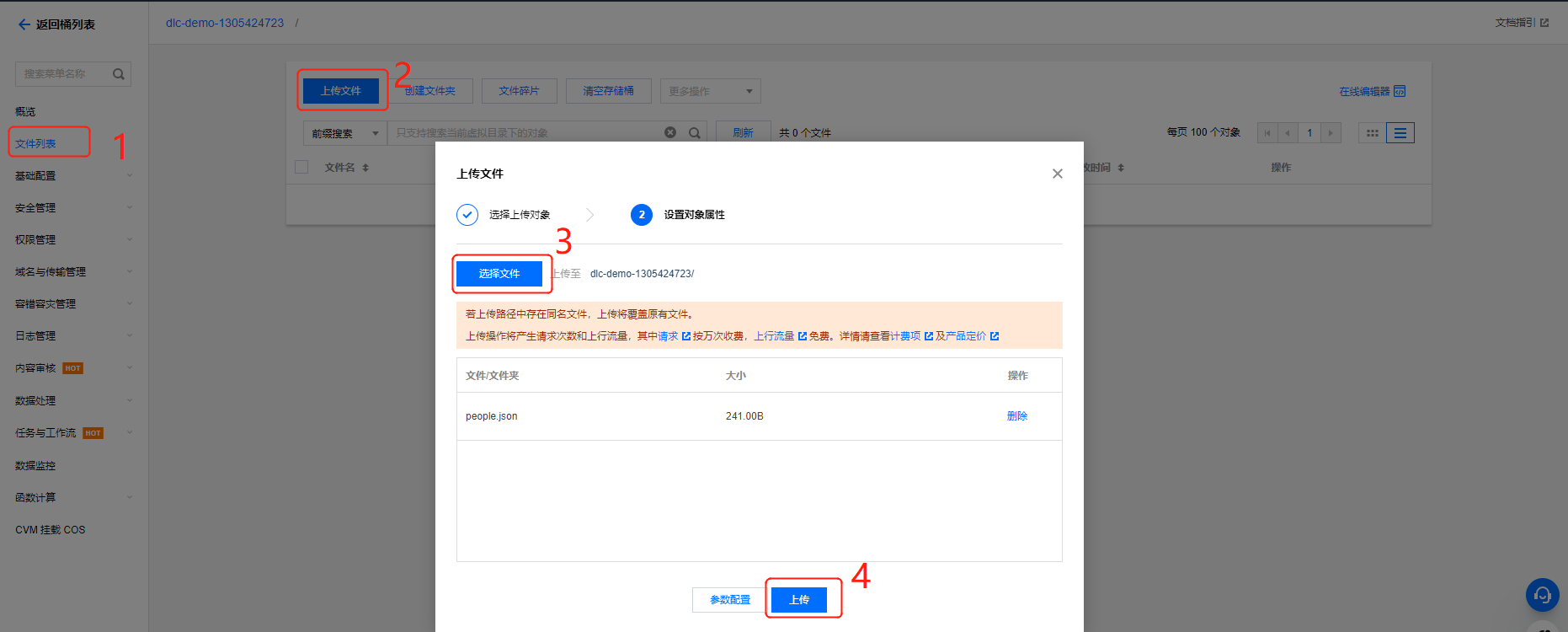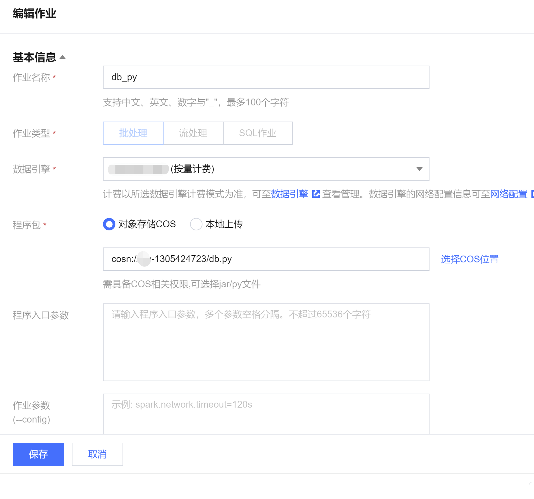 程序包 | 选择 COS,在 上传 py 文件到 COS 步骤的上传 py 文件: 从 COS 上读写数据就选择: cosn://dlc-demo-1305424723/cos.py 在 DLC 上建库、建表等选择:cosn://dlc-demo-1305424723/db.py |