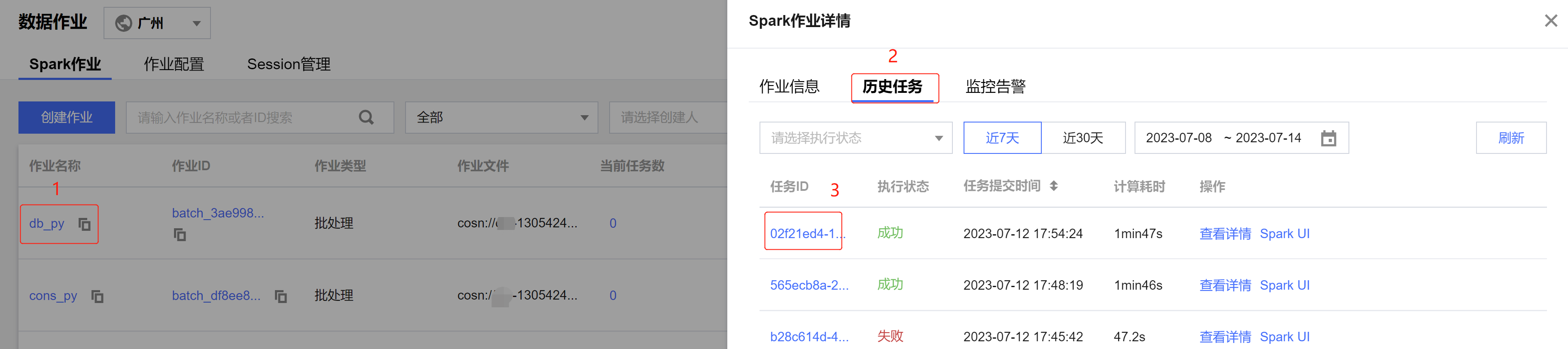 import sysfrom pyspark.sql import SparkSessionfrom pyspark.sql import Rowif __name__ == "__main__":spark = SparkSession\\.builder\\.appName("Operate data on cos")\\.getOrCreate()# 1.读cos上的数据 支持多种类型的文件 如 json,csv,parquet,orc,textread_path = "cosn://dlc-demo-1305424723/people.json"peopleDF = spark.read.json(read_path)# 2.对数据做操作peopleDF.createOrReplaceTempView("people")data_src = spark.sql("SELECT * FROM people WHERE age BETWEEN 13 AND 19")data_src.show()# 3.写数据write_path = "cosn://dlc-demo-1305424723/people_output"data_src.write.csv(path=write_path, header=True, sep=",", mode='overwrite')spark.stop()