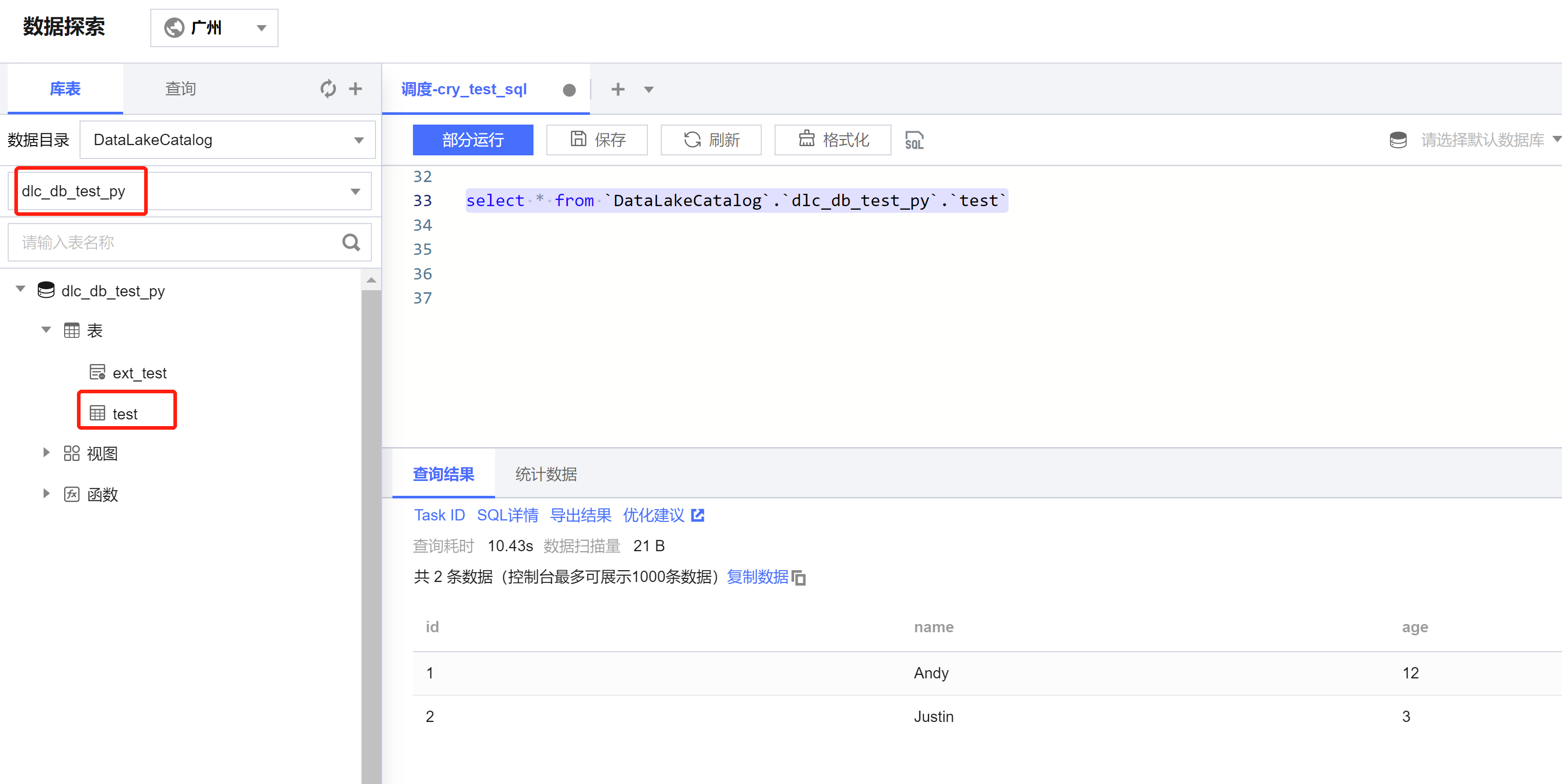from os.path import abspathfrom pyspark.sql import SparkSessionif __name__ == "__main__":spark = SparkSession \\.builder \\.appName("Operate DB Example") \\.getOrCreate()# 1.建数据库spark.sql("CREATE DATABASE IF NOT EXISTS `DataLakeCatalog`.`dlc_db_test_py` COMMENT 'demo test' ")# 2.建内表spark.sql("CREATE TABLE IF NOT EXISTS `DataLakeCatalog`.`dlc_db_test_py`.`test`(`id` int,`name` string,`age` int) ")# 3.写内数据spark.sql("INSERT INTO `DataLakeCatalog`.`dlc_db_test_py`.`test` VALUES (1,'Andy',12),(2,'Justin',3) ")# 4.查内数据spark.sql("SELECT * FROM `DataLakeCatalog`.`dlc_db_test_py`.`test` ").show()# 5.建外表spark.sql("CREATE EXTERNAL TABLE IF NOT EXISTS `DataLakeCatalog`.`dlc_db_test_py`.`ext_test`(`id` int, `name` string, `age` int) ROW FORMAT SERDE 'org.apache.hive.hcatalog.data.JsonSerDe' STORED AS TEXTFILE LOCATION 'cosn://cry-1305424723/ext_test' ")# 6.写外数据spark.sql("INSERT INTO `DataLakeCatalog`.`dlc_db_test_py`.`ext_test` VALUES (1,'Andy',12),(2,'Justin',3) ")# 7.查外数据spark.sql("SELECT * FROM `DataLakeCatalog`.`dlc_db_test_py`.`ext_test` ").show()spark.stop()