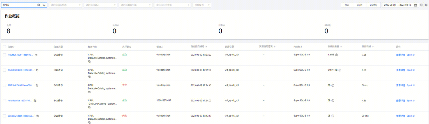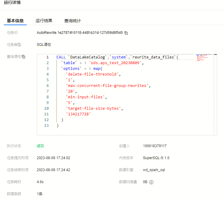 // 针对upsert_cast表开启生命周期并设置生命周期时间为7天,且不继承数据库策略ALTER TABLE `DataLakeCatalog`.`axitest`.`upsert_case` SET TBLPROPERTIES('smart-optimizer.inherit'='none', 'smart-optimizer.lifecycle.enable'='enable', 'smart-optimizer.lifecycle.expiration'='7');