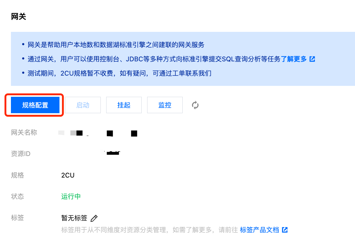 网关默认提供规格为2CU(不收费),如有升配需求。可通过点击网关详情→选择规格配置进行调整购买