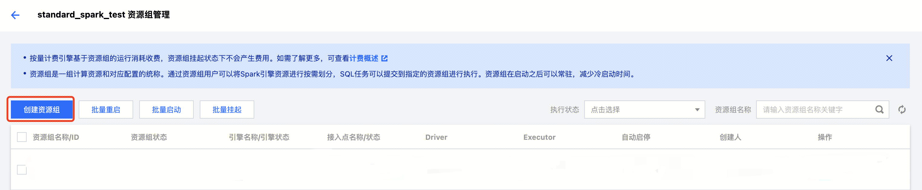 2. 进入资源管理组界面,单击创建资源组,进行自定义资源组配置。或查看使用 DLC 默认配置资源组(无需配置)。