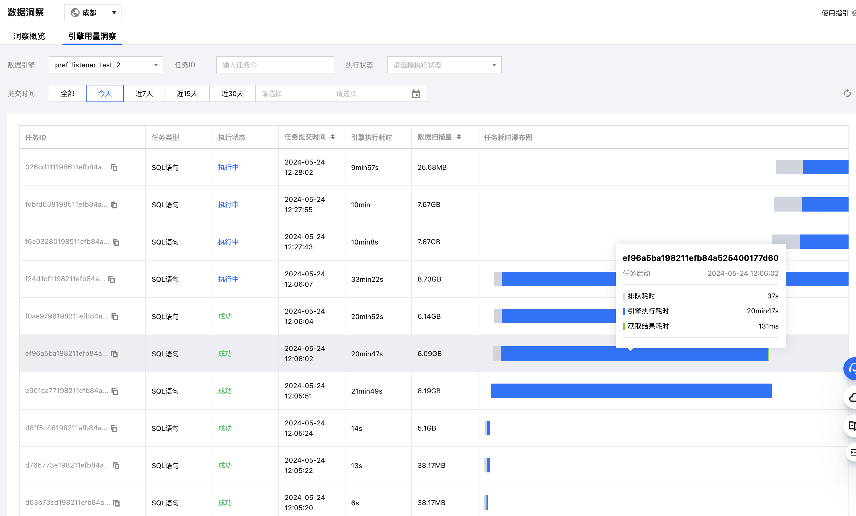 引擎用量洞察以引擎为维度,把引擎下的所有任务从提交到引擎内执行情况的分布情况统一展示出来,帮助客户可以快速分析引擎的使用大致情况。