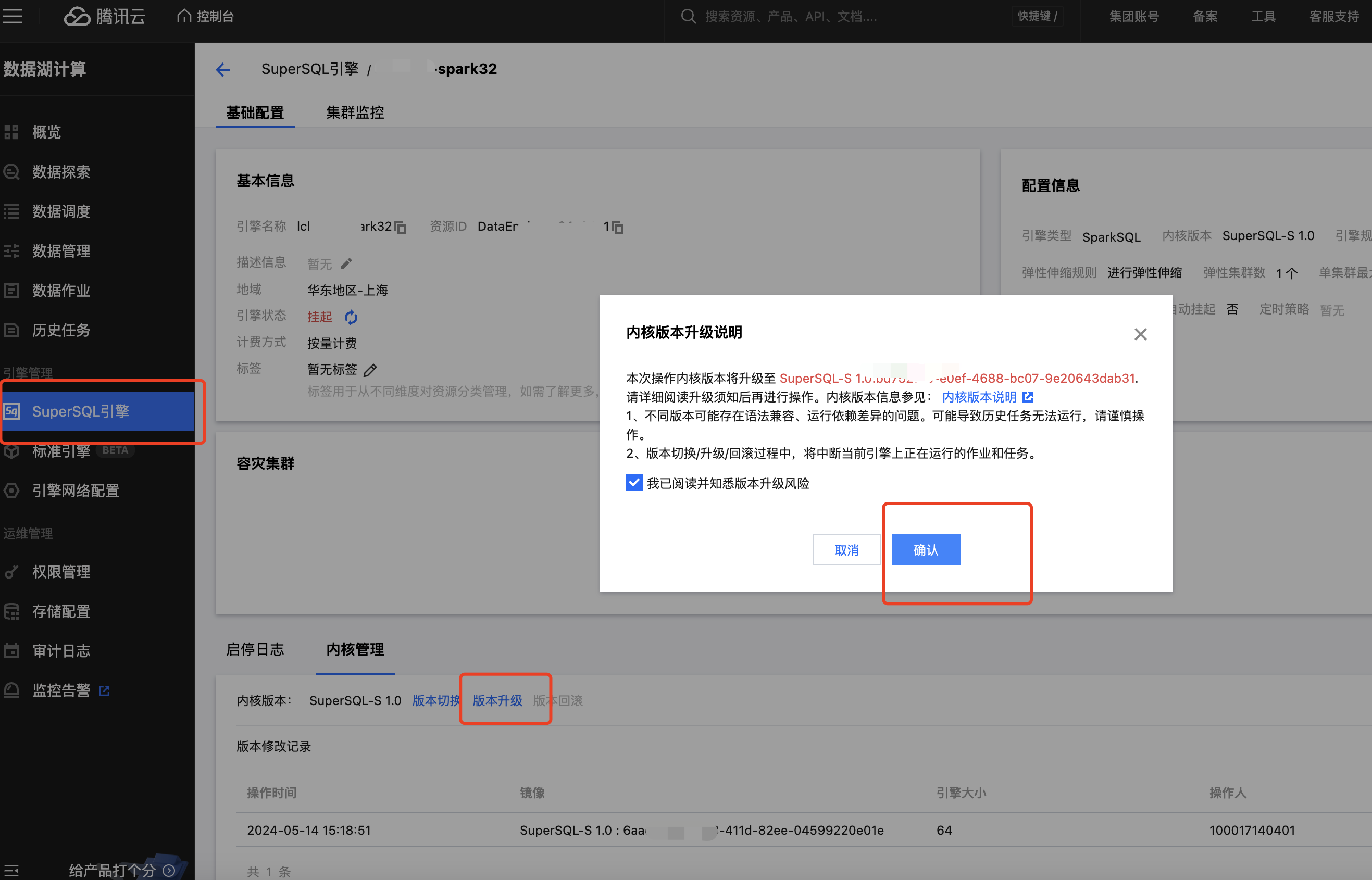 进入 SuperSQL 引擎列表页 ,选择需要洞察的引擎名称→内核管理→点击版本升级(默认升级到最新内核)