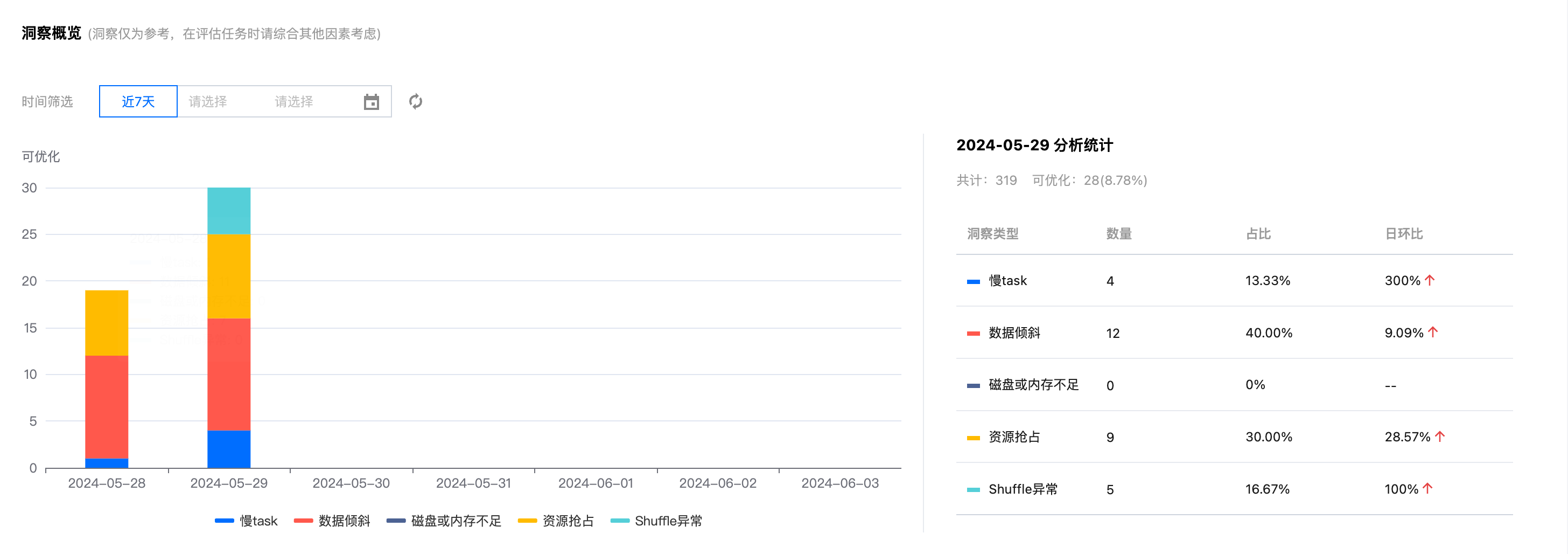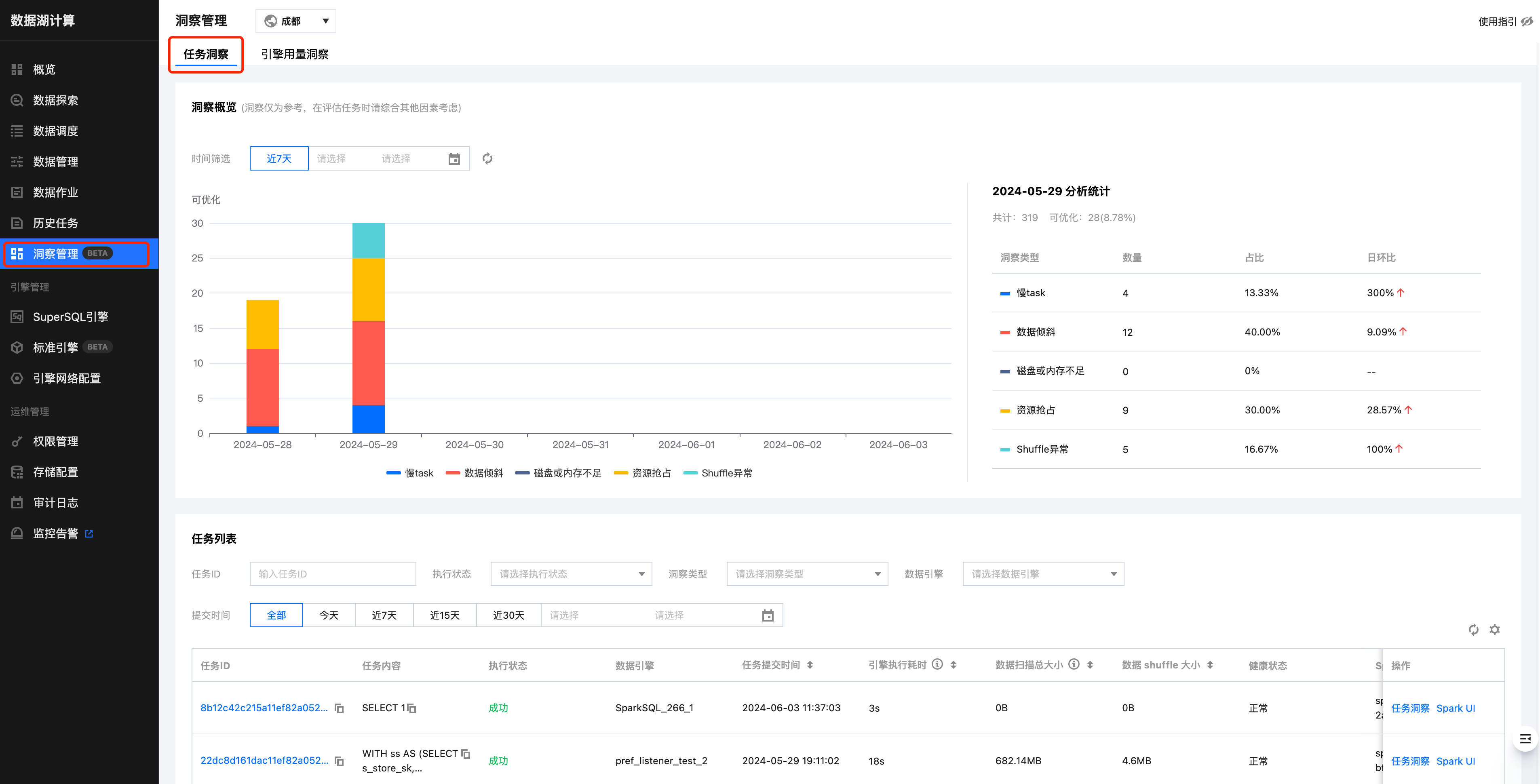 任务洞察功能支持分析每个任务执行过的汇总 metrics 以及洞察出可优化的问题。