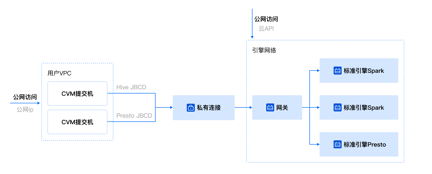 构建,如果您有 JDBC 等方式访问引擎和数据的需求,您可以通过创建终端节点,实现用户侧的 VPC 与接入点建立安全稳定的私有连接。