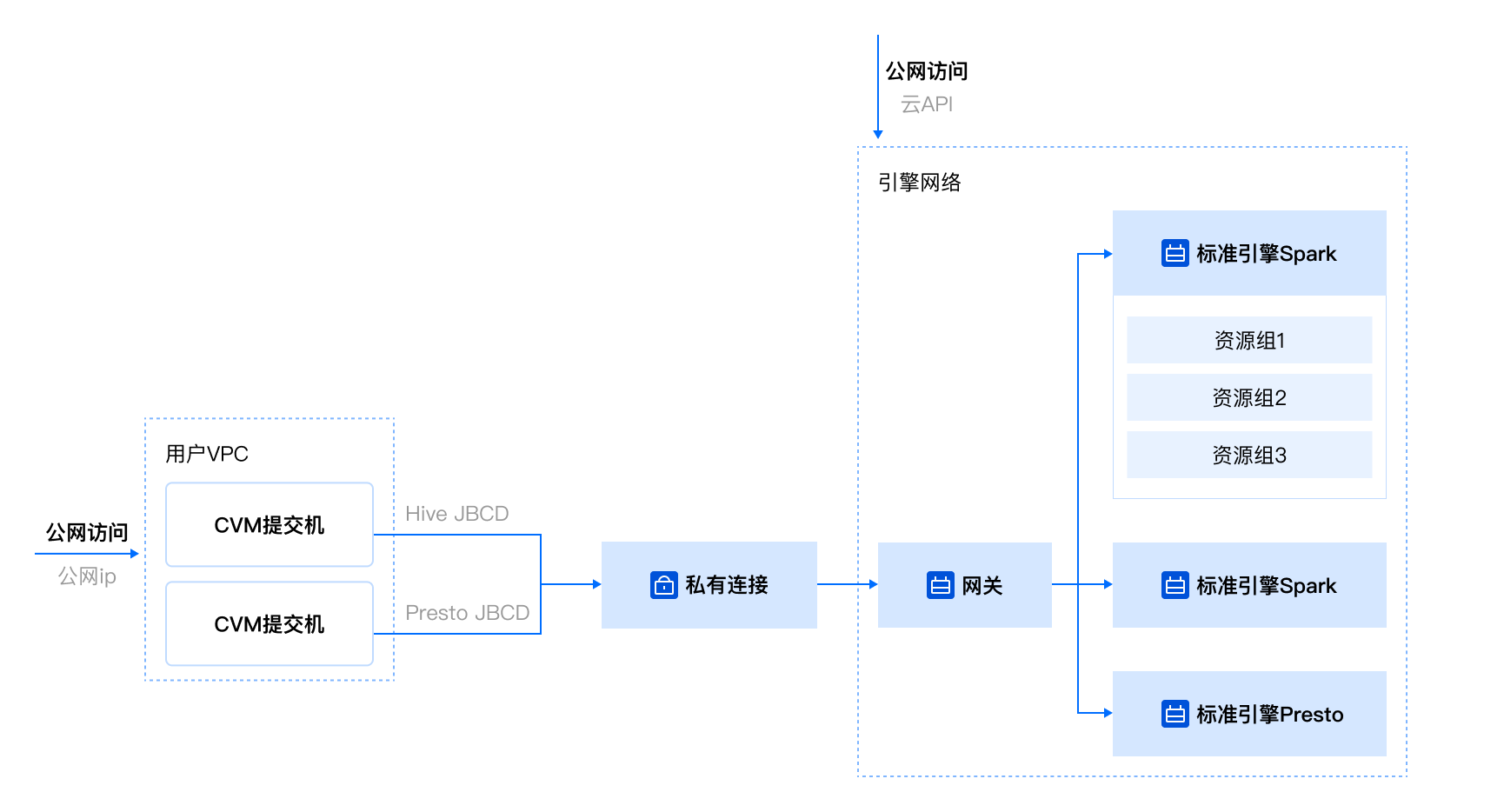 通过私有连接,能够打通用户账户 VPC 到标准引擎的网络,用户可以通过该 VPC 下的服务器进行任务提交。 | |