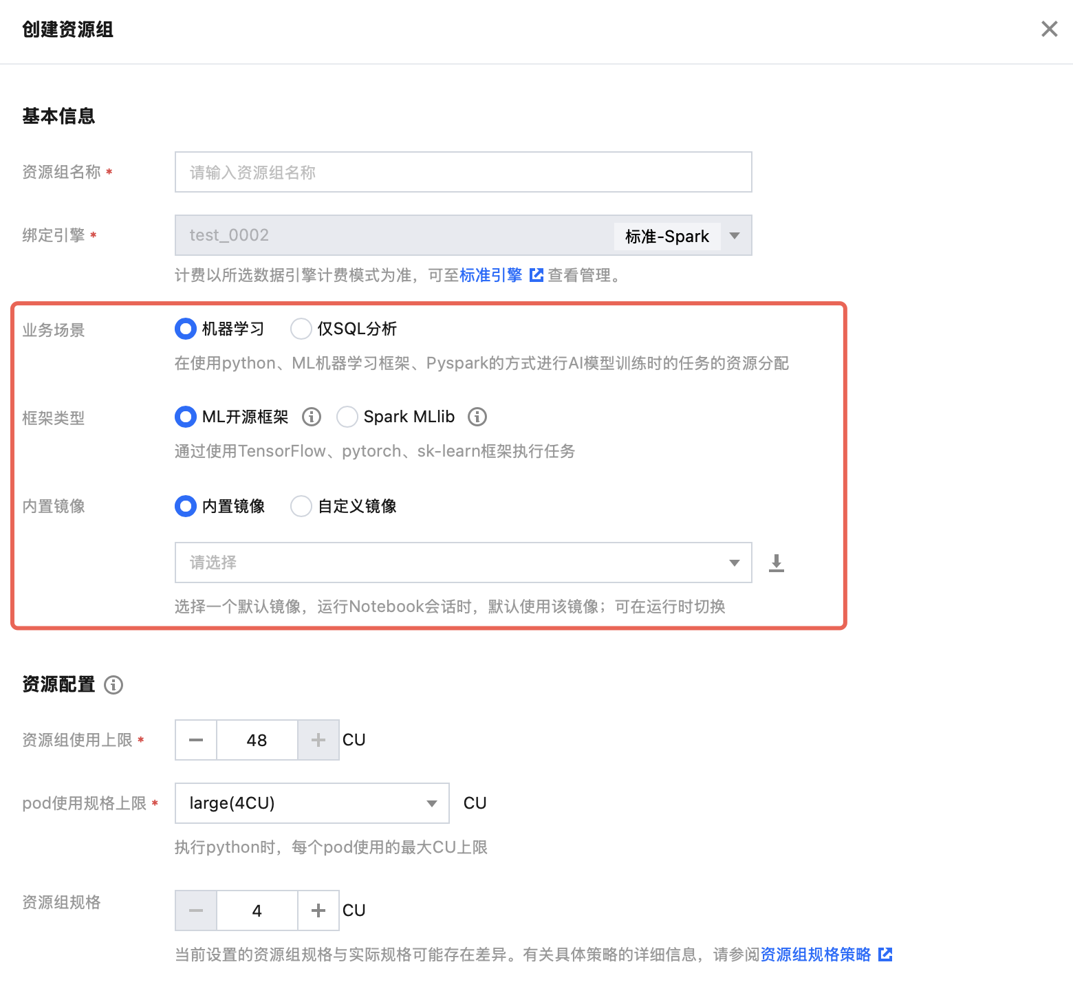 机器学习 | 如果您选择的 DLC 数据引擎中含有“机器学习”类型的资源组,则会出现该选项,并默认选中。 | |