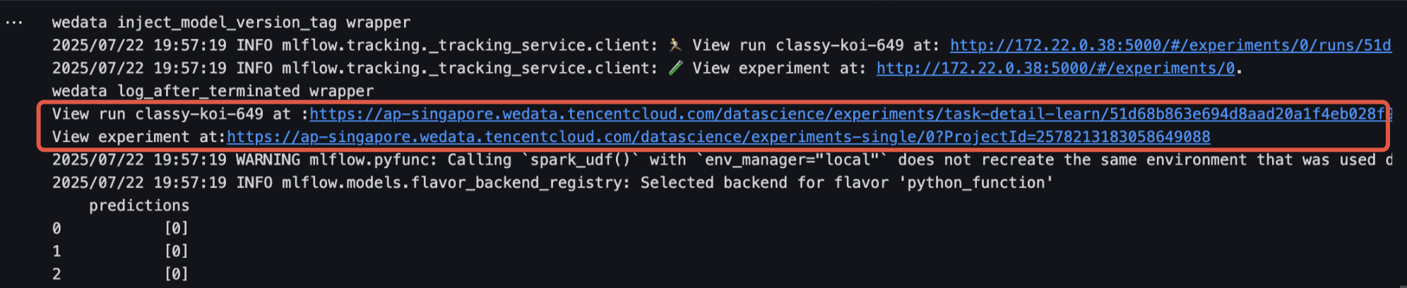 from pyspark.sql import SparkSessionfrom sklearn import datasetsfrom sklearn.neighbors import KNeighborsClassifierimport mlflowfrom mlflow.models import infer_signaturespark = SparkSession.builder.getOrCreate()#加载数据集#方法一:通过机器学习库加载数据集X, y = datasets.load_iris(as_frame=True, return_X_y=True)#方法二:通过tencentcloud-dlc-connector加载DLC中数据#安装驱动!pip install tencentcloud-dlc-connector!pip install --upgrade 'sqlalchemy<2.0'#安装版本!pip install --upgrade pandas==2.2.3!pip install numpy!pip install matplotlibimport pandas as pdimport numpy as npimport tdlc_connectorfrom tdlc_connector import constantsmlflow.sklearn.autolog()#使用 tdlc-connector 按照表方式访问conn = tdlc_connector.connect(region="ap-***", #填入正确地址,如ap-Singapore,ap-Shanghaisecret_id="*******",secret_key="*******",engine="your engine",#填入购买的引擎名称resource_group=None,engine_type=constants.EngineType.AUTO,result_style=constants.ResultStyles.LIST,download=True)query = """SELECT `sepal.length`, `sepal.width`,`petal.length`,`petal.width`,species FROM at_database_testnotebook.demo_test_sklearn"""iris = pd.read_sql(query, conn)spark_iris = spark.createDataFrame(iris)#划分特征列与目标列feature_cols = ["sepal_length", "sepal_width", "petal_length", "petal_width"]X = spark_iris.select(feature_cols)X = spark_iris.select(feature_cols)y = spark_iris.select("species")#使用K近邻算法进行分类model = KNeighborsClassifier()model.fit(X, y)predictions = model.predict(X)signature = infer_signature(X, predictions)with mlflow.start_run():model_info = mlflow.sklearn.log_model(model, artifact_path="model", signature=signature)infer_spark_df = spark.createDataFrame(X)pyfunc_udf = mlflow.pyfunc.spark_udf(spark, model_info.model_uri)result = infer_spark_df.select(pyfunc_udf(*X.columns).alias("predictions")).toPandas()print(result)