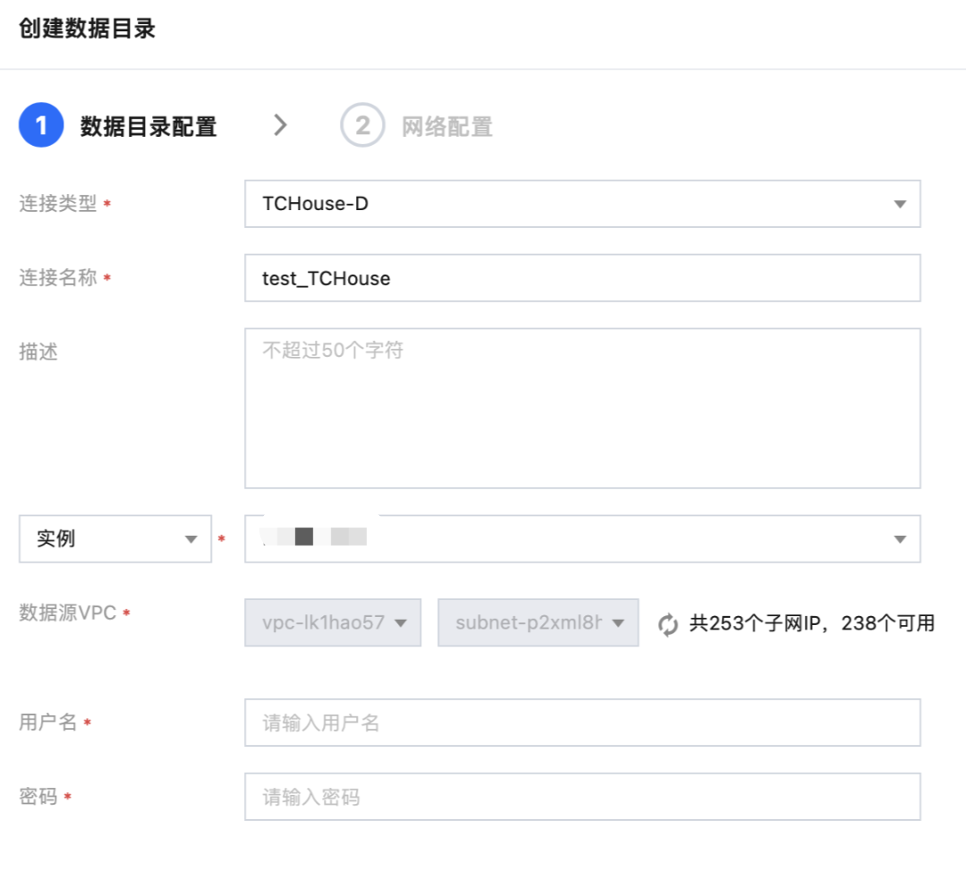 3. 进入数据源创建可视化界面,连接类型选择 TCHouse-D。填写连接信息后,完成网络配置,打通引擎和外部数据源的网络。
