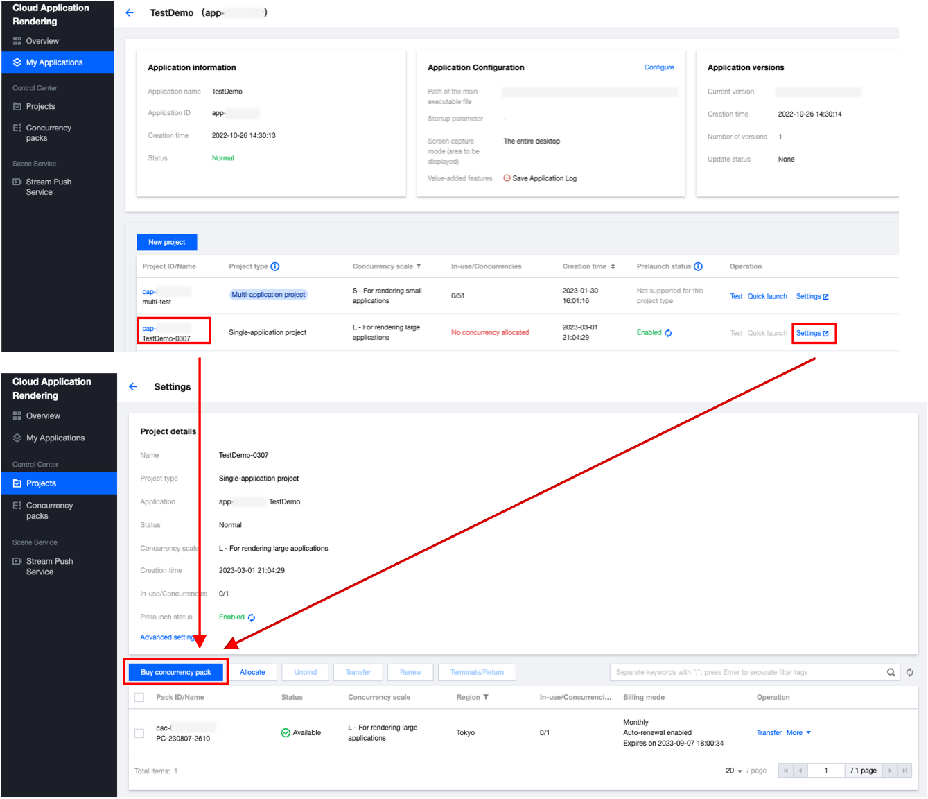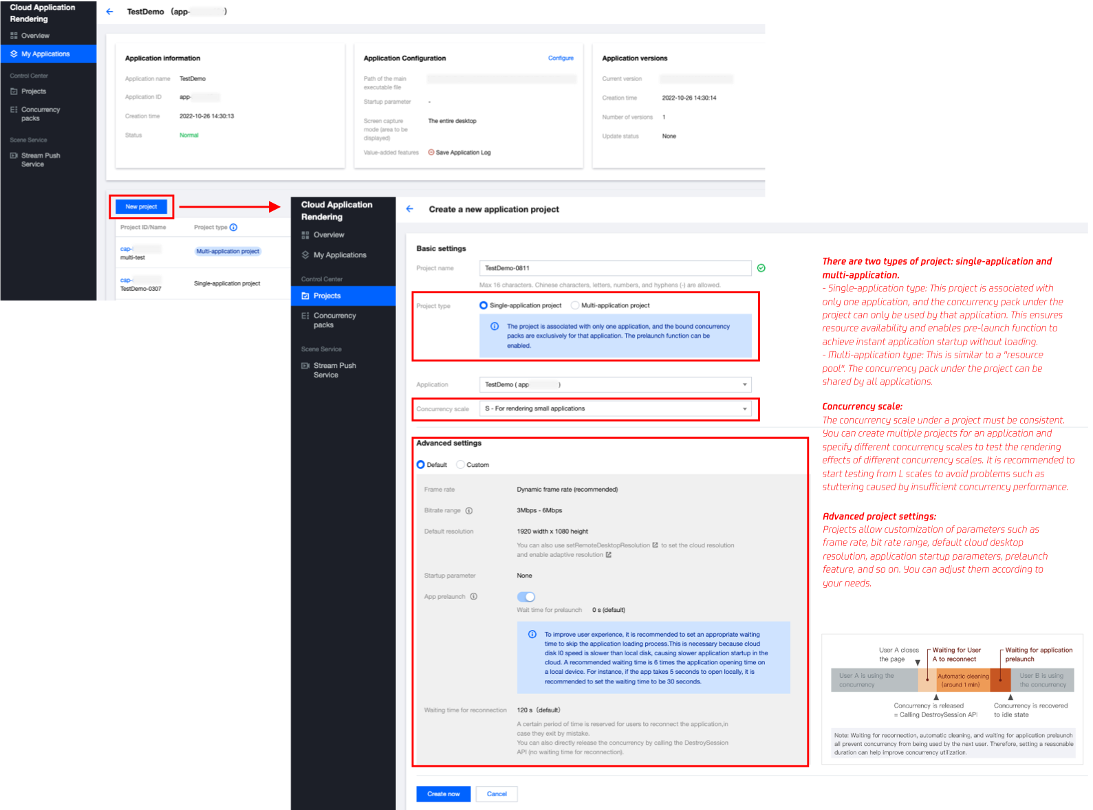 项目类型:支持单应用独享和多应用共享两种类型的项目。单应用独享类型可以确保项目下的并发包仅被单个应用使用,而多应用共享类型下的并发包则可以作为“资源池”被多个应用共享使用。单击查看 如何通过多应用共享项目实现并发资源共享。 并发规格:一个项目下的并发规格需一致。您可以针对一个应用新建多个项目,指定不同规格的并发,从而测试不同规格并发的运行效果。建议您从 L / XL型开始测试,避免因并发性能不满足应用运行需求导致卡顿等问题。不同规格并发的具体配置请参考计费说明。 项目高级设置:项目允许自定义帧率、码率范围、默认云端桌面分辨率、应用启动参数、预启动、等待重连时长等参数,您可根据需求调整。详细请参考项目高级设置说明。 2. 在项目下购买并发包,等待并发包创建完成后,可以进入下一步效果测试。