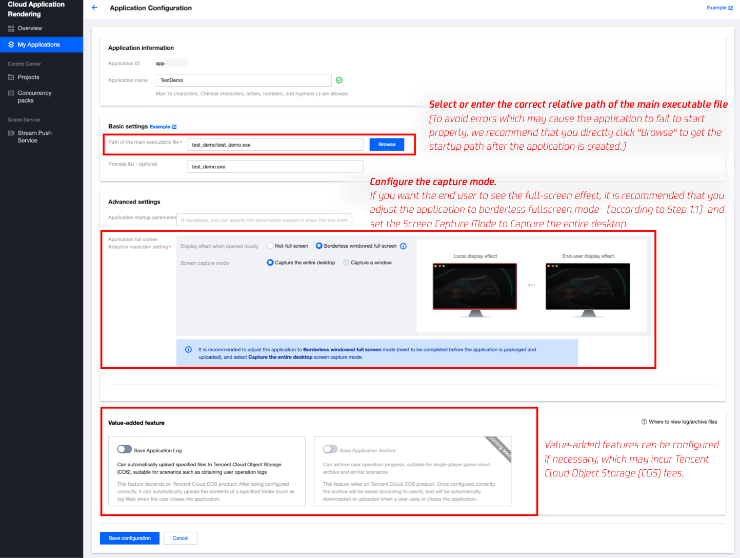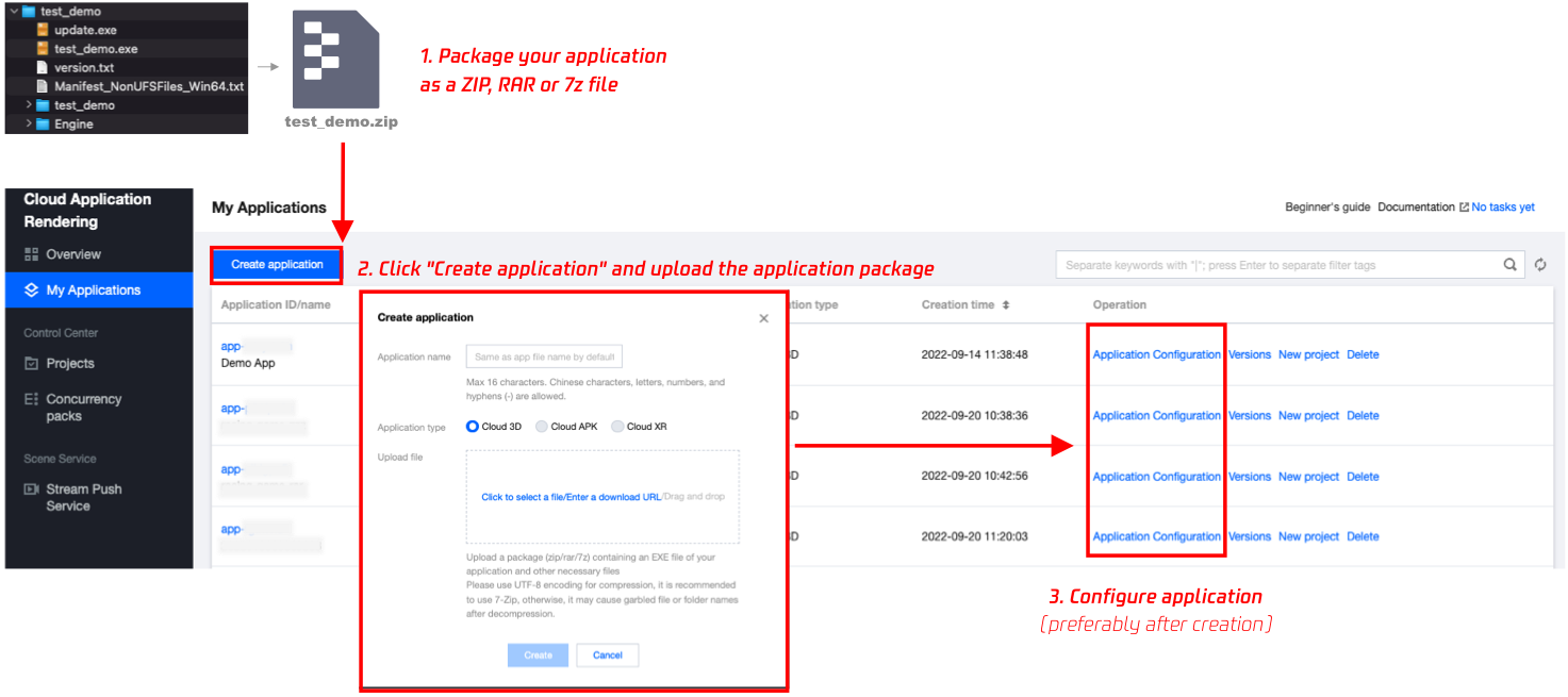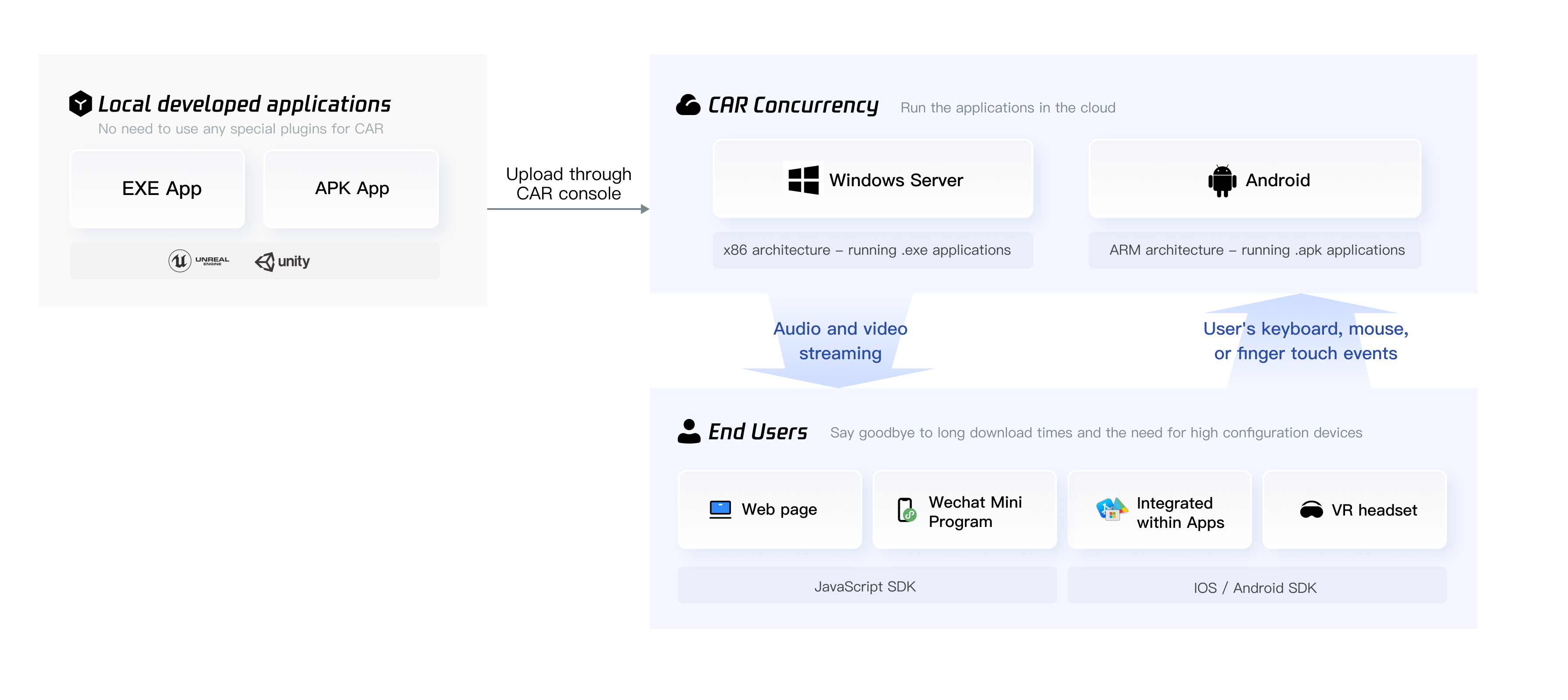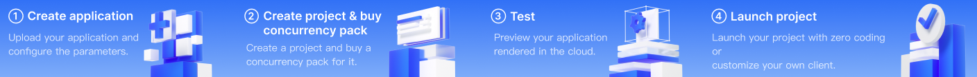 应用云渲染是一套整合了应用管理、并发资源管理与调度、音视频串流等能力的 PaaS 产品。它可以在云端并发实例上运行您开发好的应用 (EXE/APK 应用),终端用户无需下载应用包即可通过小程序、网页等体验应用。我们提供的终端 SDK 可将并发实例中渲染出来的音视频结果传输到终端,并将终端用户的操作实时发送给并发实例,您仅需确保应用可在 Windows Server 或 Android 环境正常运行,无需任何特殊插件即可轻松实现应用云化。