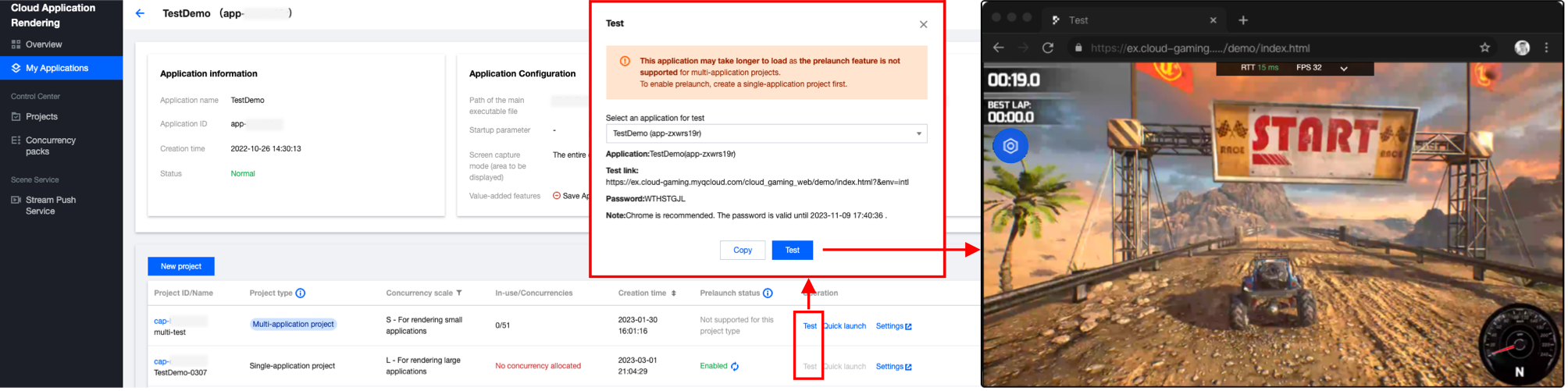 在控制台中,建议您按照 上传应用、新建项目、购买并发 的顺序操作,得到一个关联某款应用,并且分配有可用并发的项目。然后您可以针对该项目和应用进行 效果测试,体验应用云化的基础效果,并选出最合适的并发规格。完成效果测试后,您可以对项目进行上线发布,我们支持: