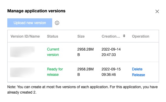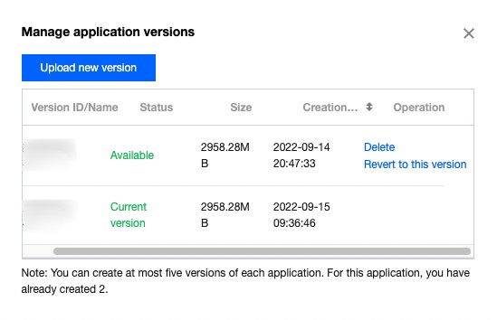 应用云渲染提供应用版本管理能力,同一个应用 ID 下,您最多可维护5个版本,并且实现新版本上传、新版本发布、版本回滚等操作。
