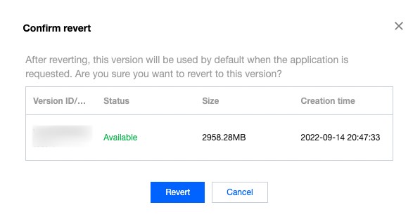 4. 在版本回滚确认弹框中确认信息无误后单击回滚,即可完成版本回滚操作。