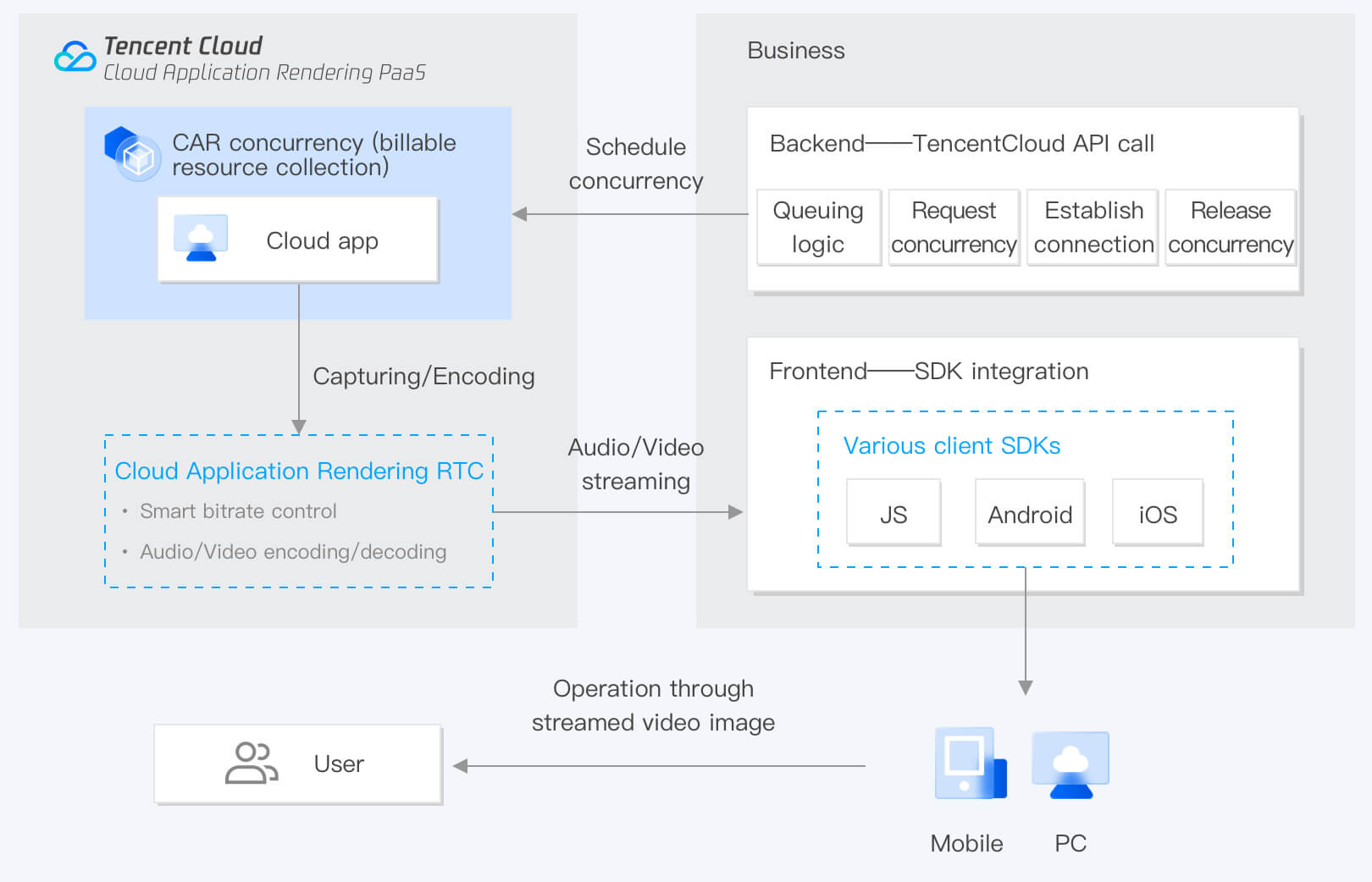后台接入云 API,业务前端集成 SDK。