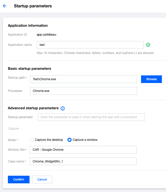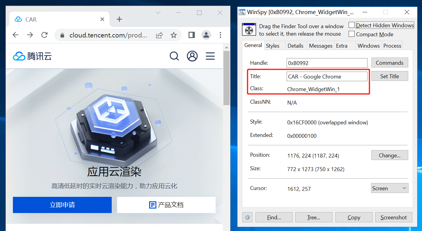 应用云渲染服务提供了捕捉云上应用窗口画面,供用户使用。您需要提供应用窗口的应用类名及标题名(标题名即应用启动时的窗口名称)。