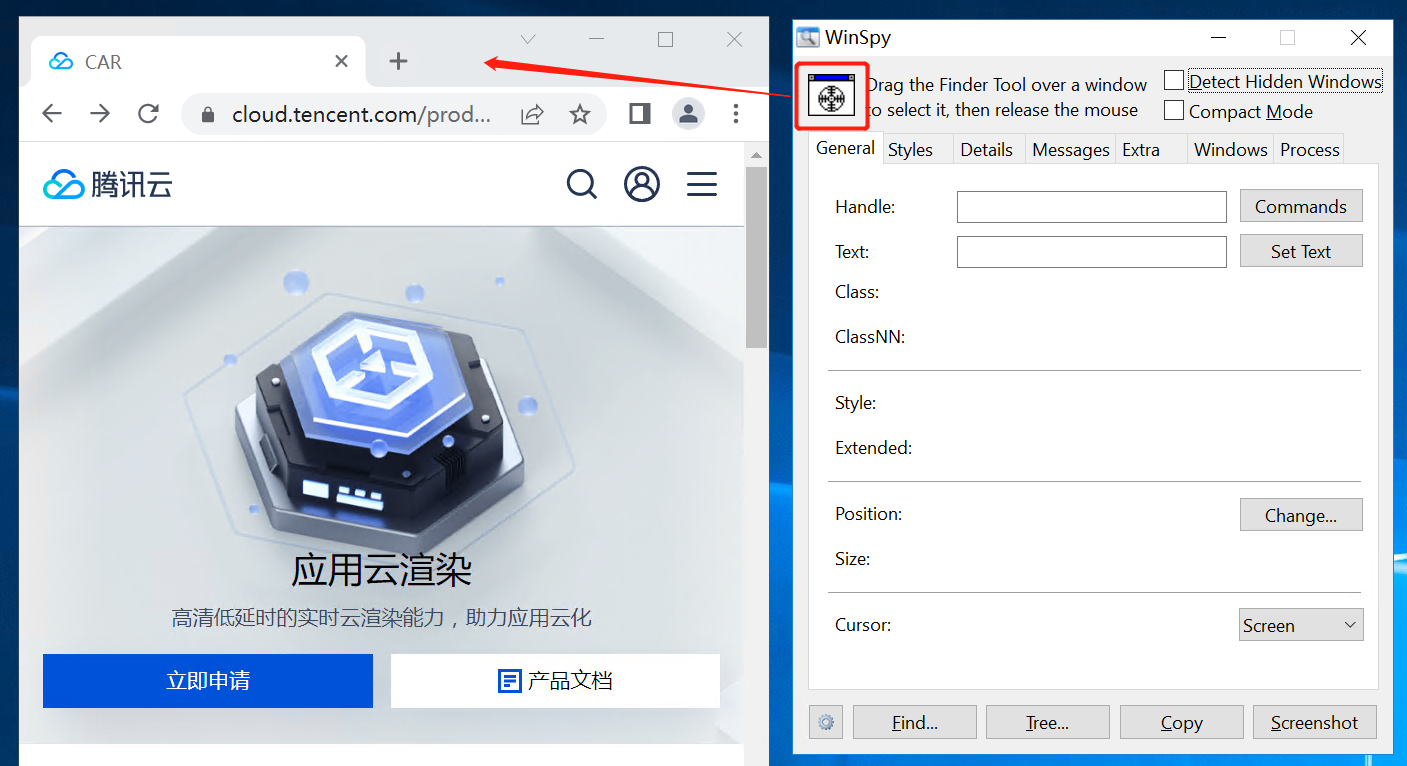 3. 本地电脑打开需要捕捉的应用(此处仅以 Chrome 浏览器窗口为例,实际是需要本地打开您的 exe 应用程序),将下图红框中 WinSpy 的组件先通过按住移动的方式移到应用窗口中,接着松开组件。