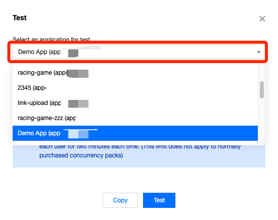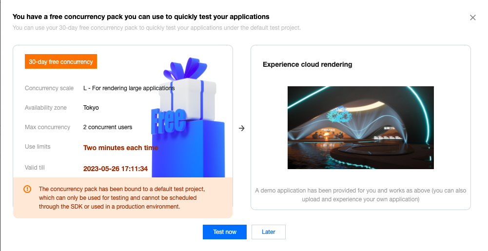 默认测试项目与新手免费并发包仅用于效果测试,每位用户每次可使用2分钟,不支持通过 SDK 调度并正式上线使用。