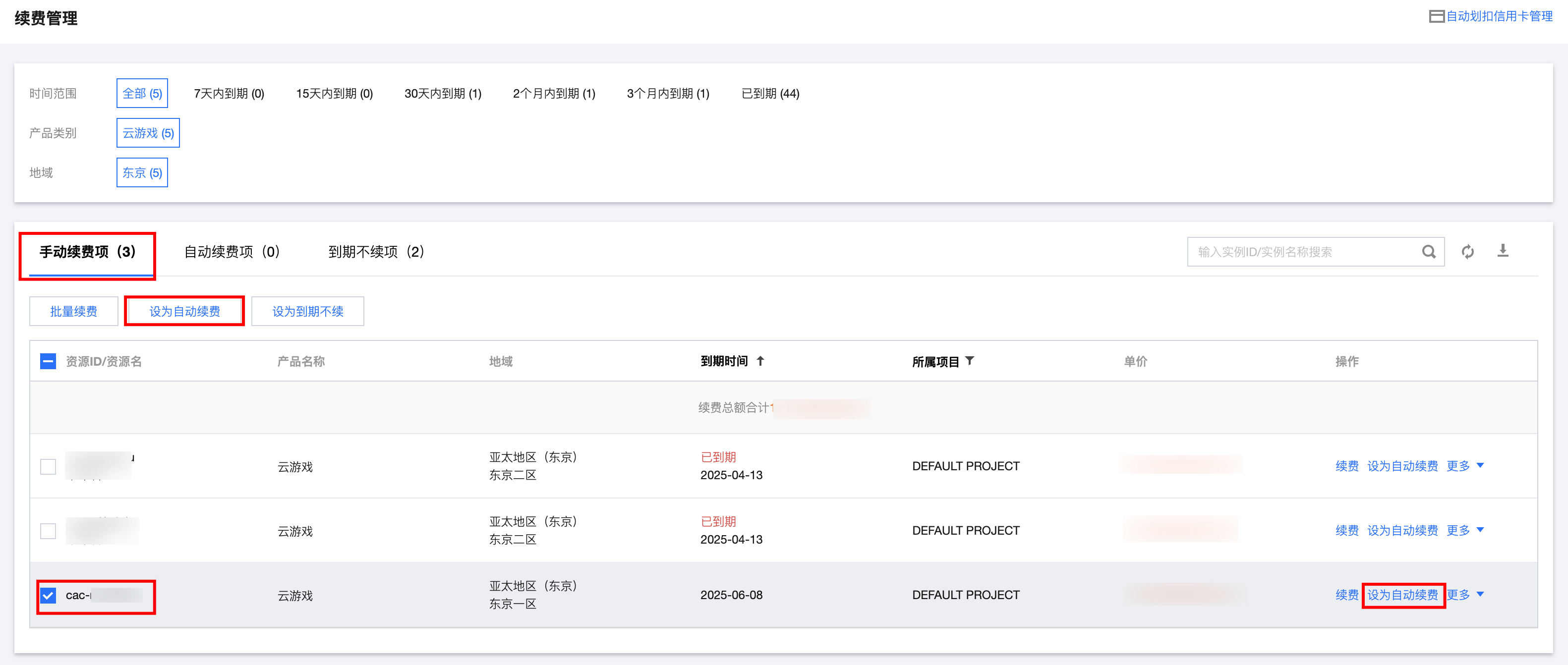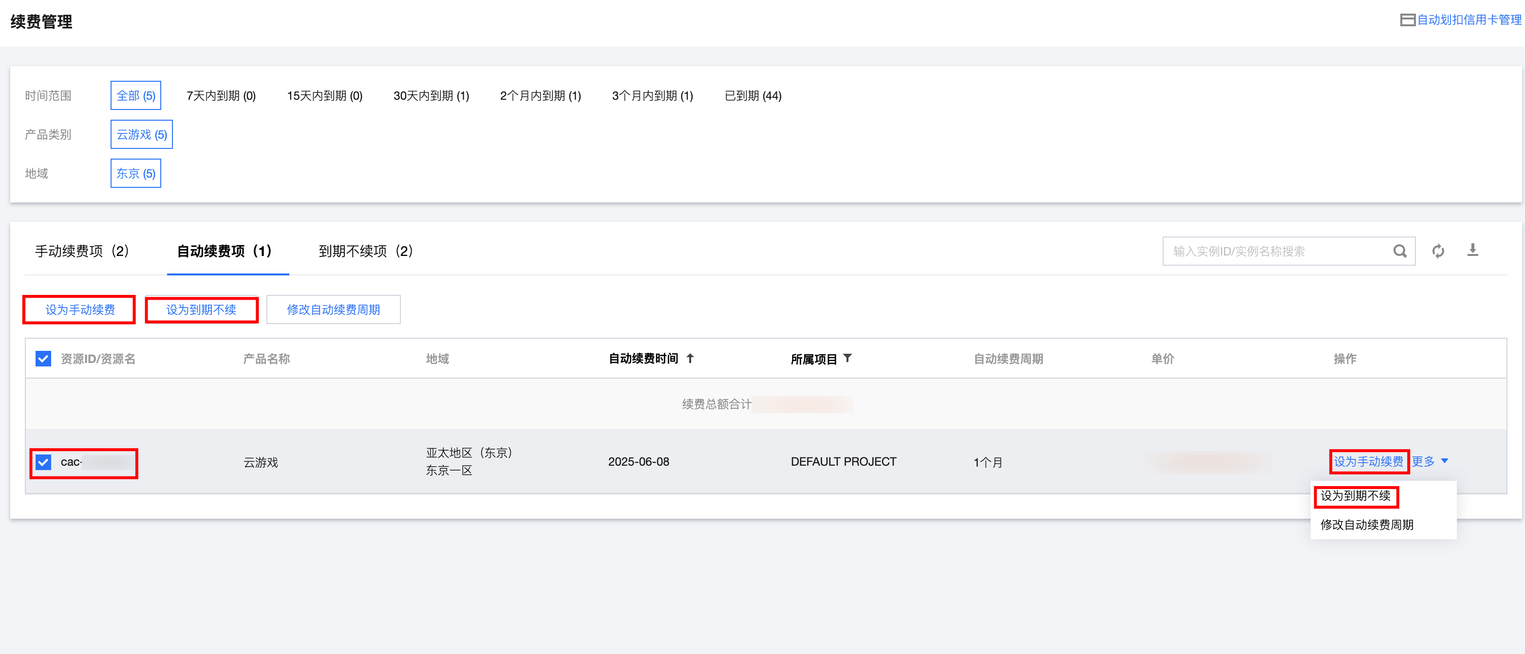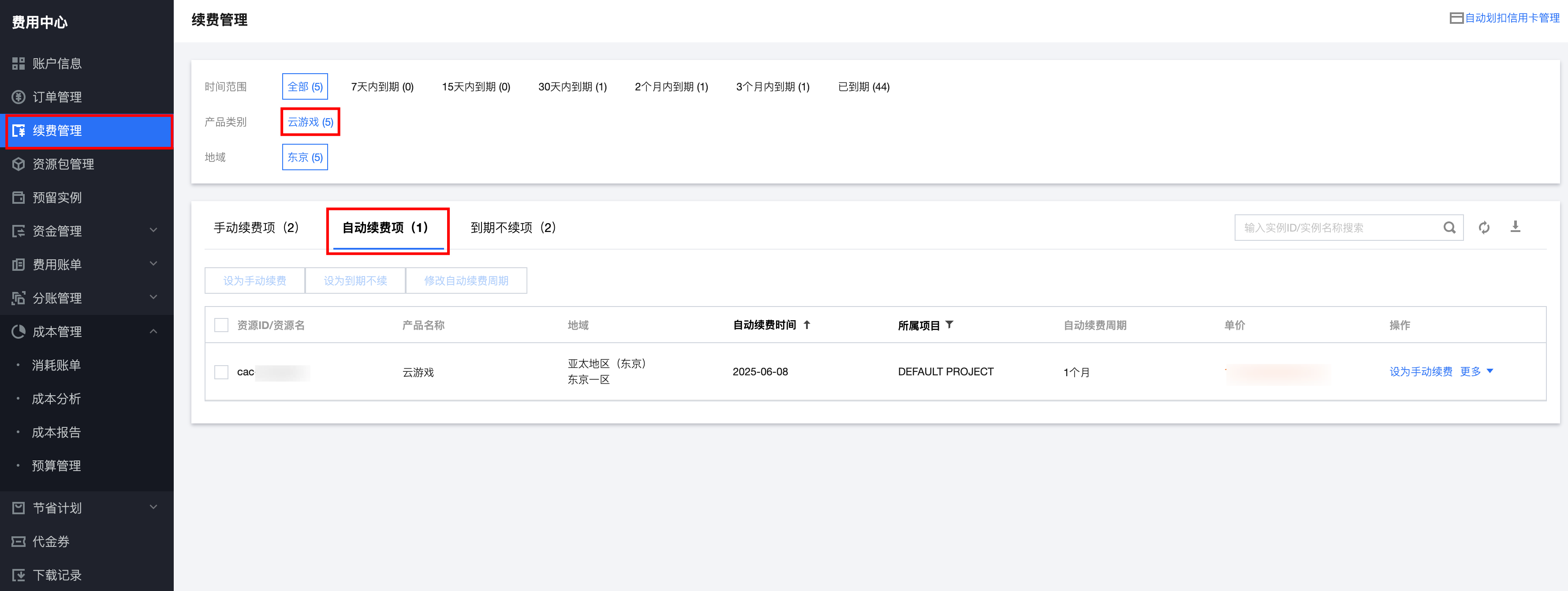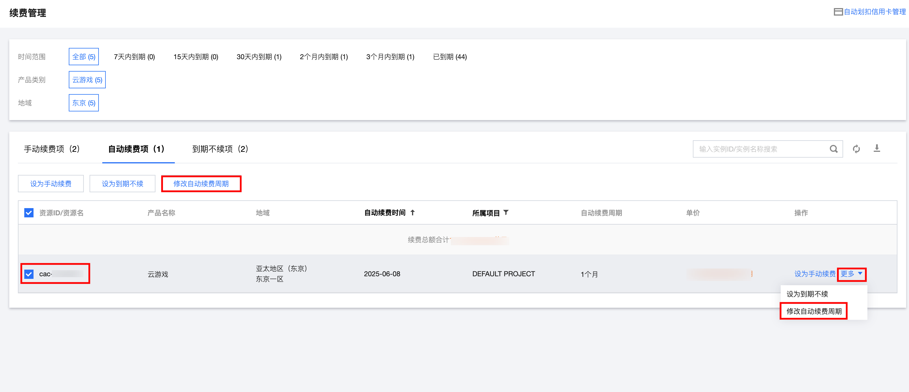 1. 登录 费用中心 > 续费管理页 ,在上方导航栏中, 产品类别选择云游戏 ,单击自动续费项,查看自动续费的产品相关信息。如下图: 2. 找到您想要查阅的自动续费的产品,设置自动续费时期:勾选产品后单击上方修改自动续费周期,或者单击更多 > 修改自动续费周期。如下图: