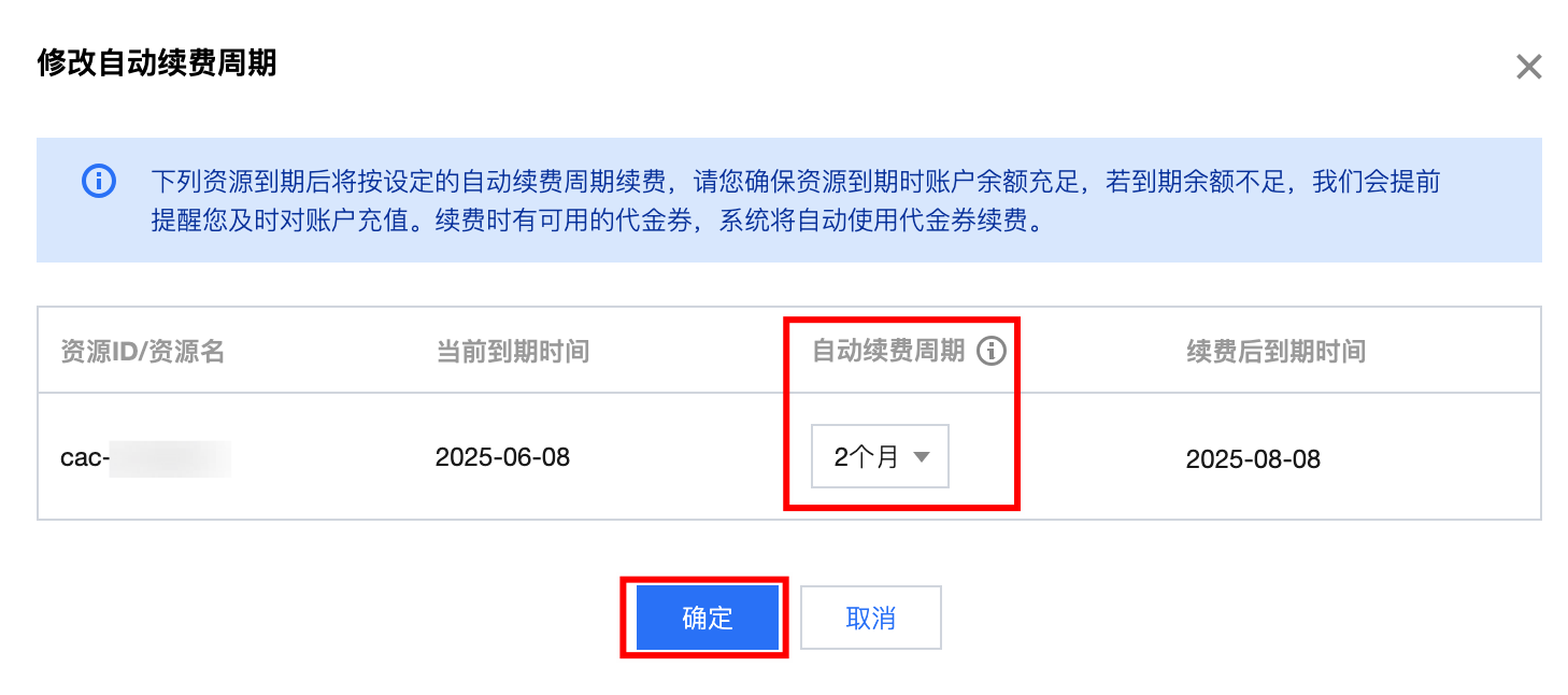 3. 在弹出的修改自动续费周期窗口,确认产品信息, 并设置自动续费周期 ,确认无误后单击确定。如下图: