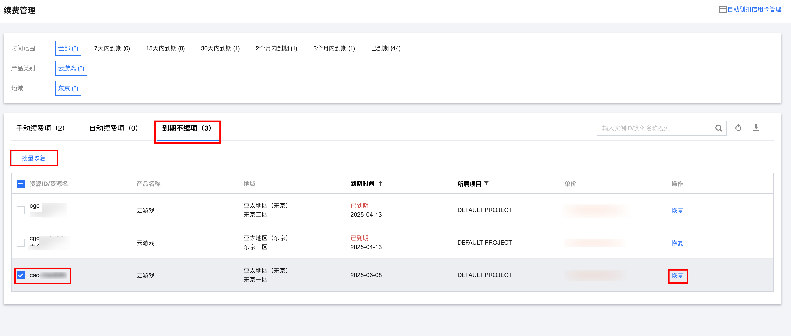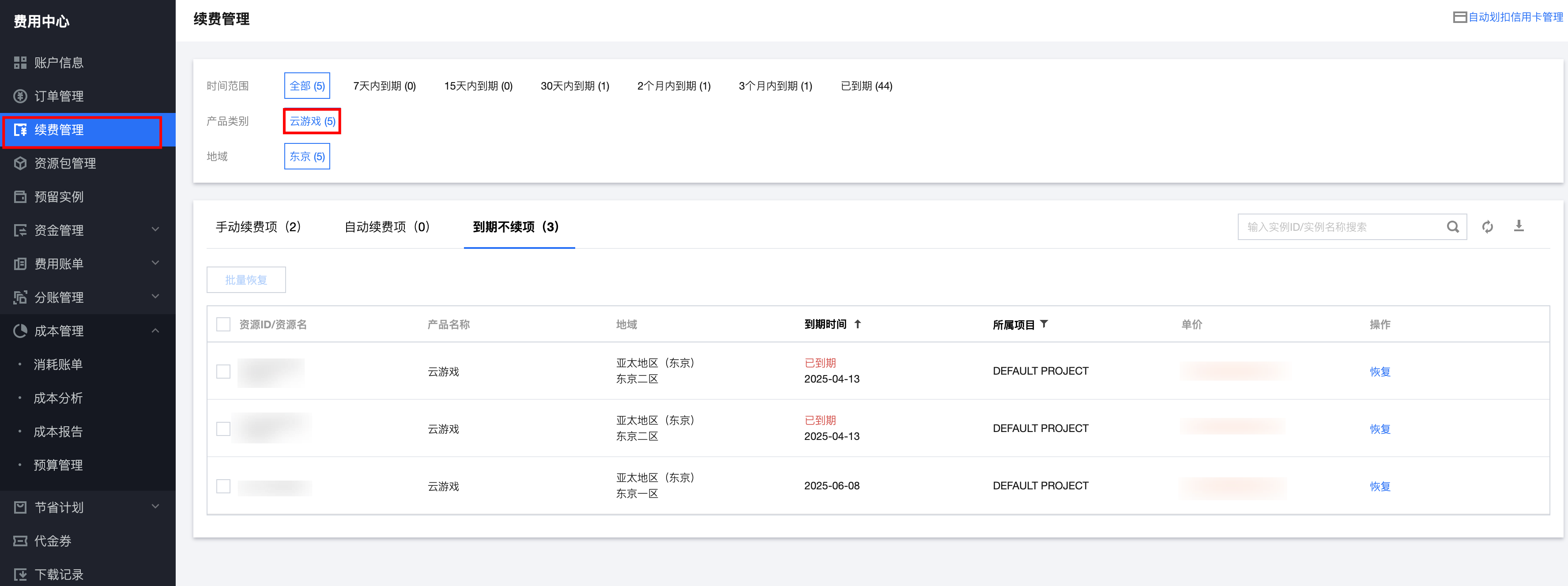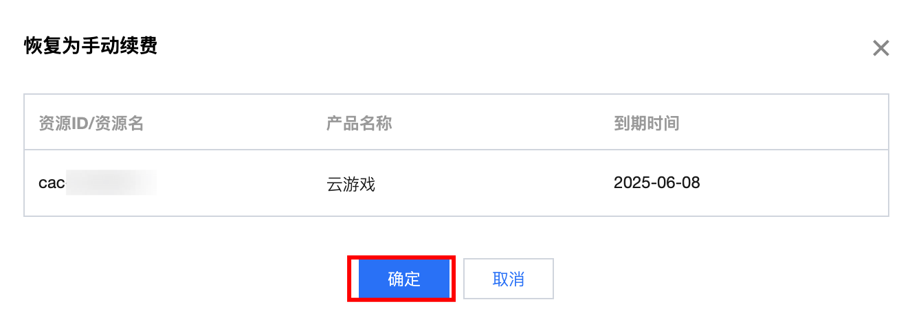 2. 找到您想要订阅自动续费的云游戏产品,对于到期不续费的产品,需要先将其设置为手动续费,单击恢复进行设置。如下图: