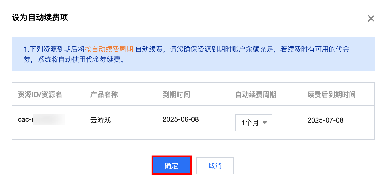 5. 在弹出的自动续费窗口,确认产品信息,确认无误后,单击确定。如下图: