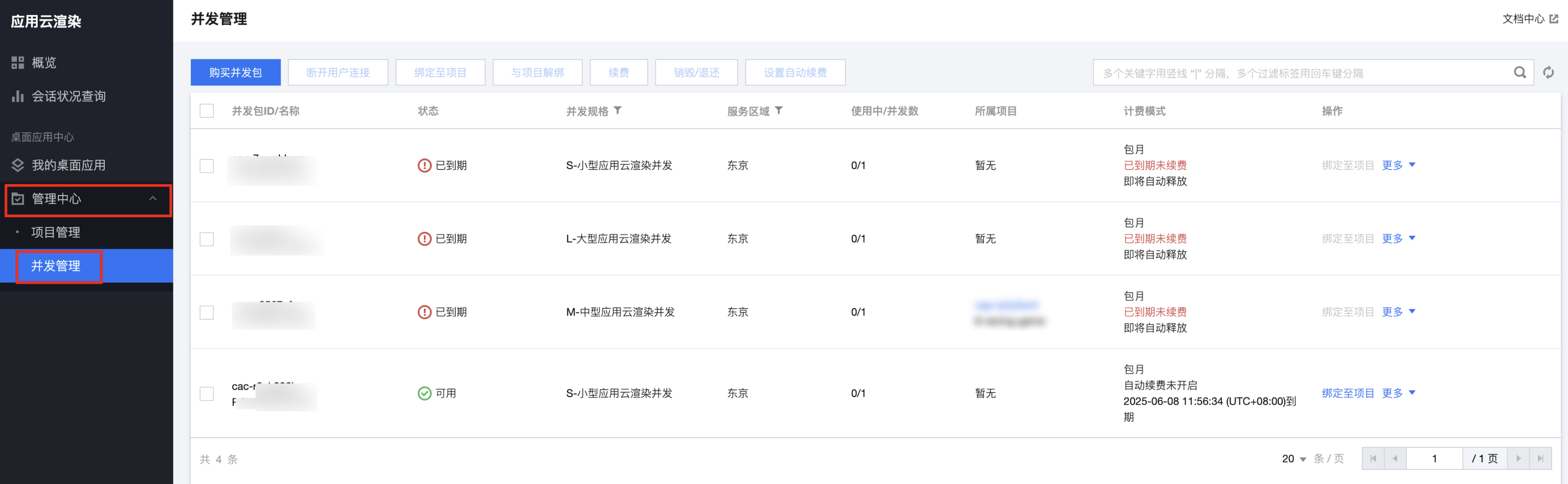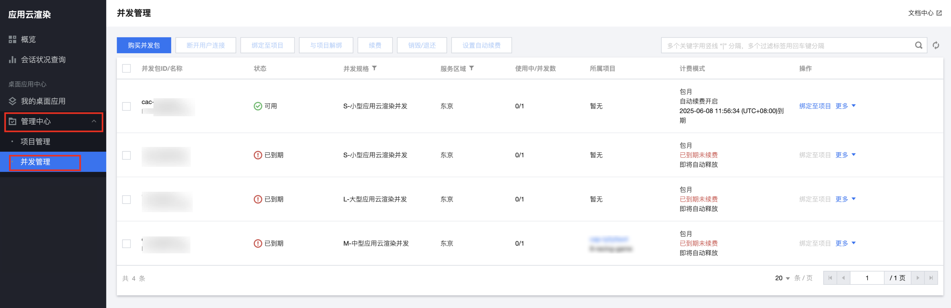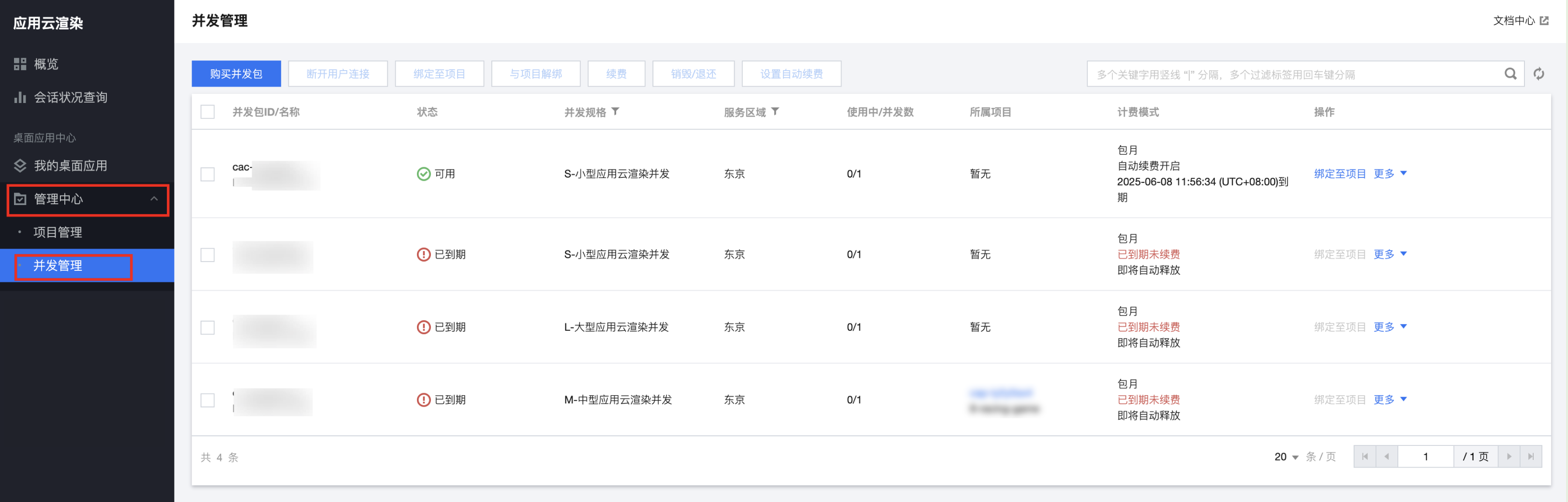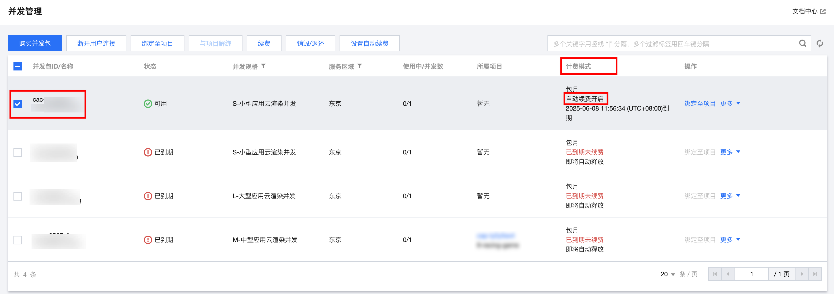 2. 找到您想要查阅的自动续费的应用云渲染并发包,在计费模式处查看自动续费相关信息。如下图:
