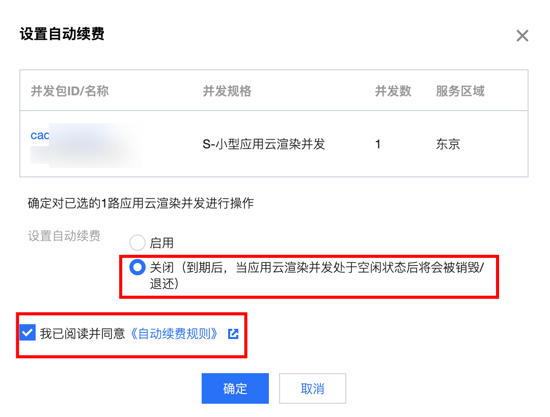 3. 在弹出的设置自动续费窗口,确认产品信息,确认无误后选择关闭自动续费,勾选同意 自动续费规则,单击确定。如下图: 通过费用中心取消自动续费服务