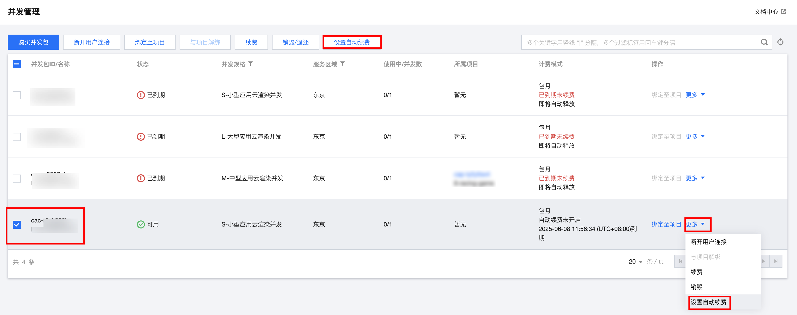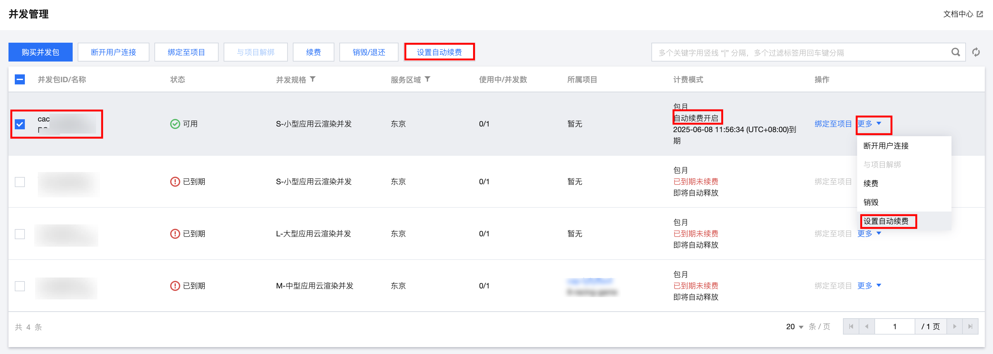 2. 找到您想要订阅自动续费的并发包,勾选并在上方购买栏处单击设置自动续费,或者在操作处单击更多 > 设置自动续费。如下图: