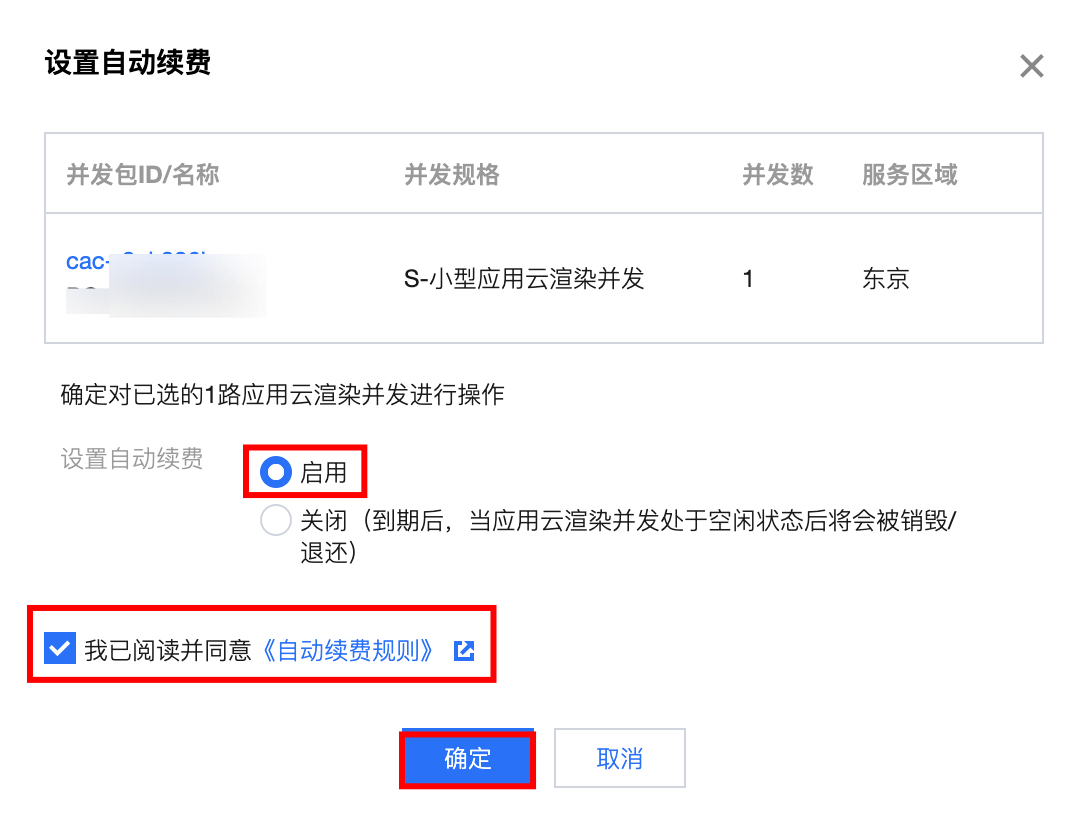 3. 在弹出的自动续费窗口,确认并发包信息,确认无误后勾选同意 自动续费规则,选择启用自动续费。如下图: 通过费用中心开通自动续费服务