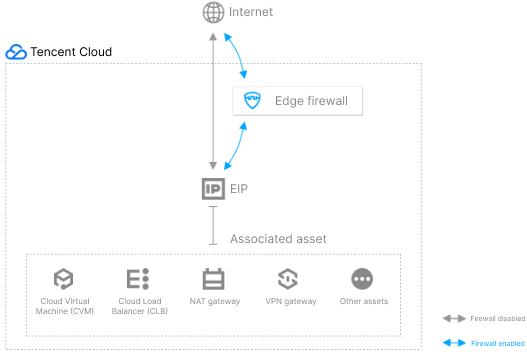 互联网边界防火墙是检测南北向流量的防火墙,是一种集群式防火墙。互联网边界防火墙生效于您的弹性公网 IP 的关联资产与外部互联网之间,原理如下图所示: