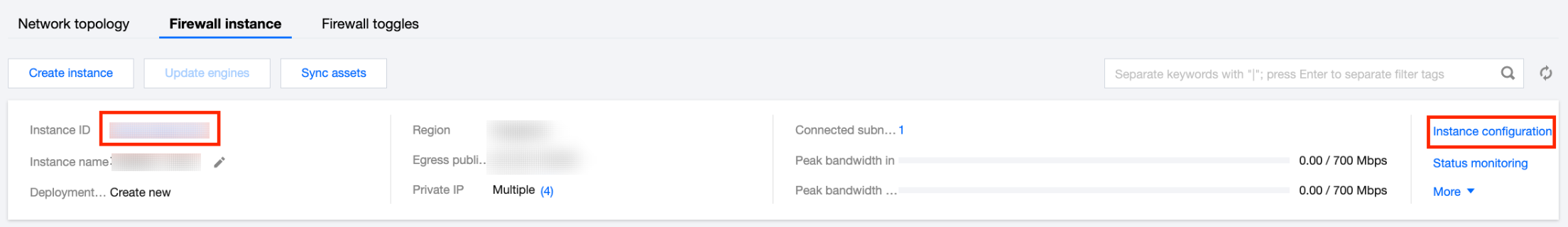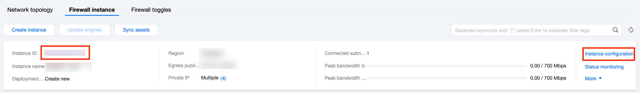 1. 在 NAT 边界开关 > 防火墙实例页面,找到需要调整带宽的实例,单击实例 ID 或者右侧的实例配置。