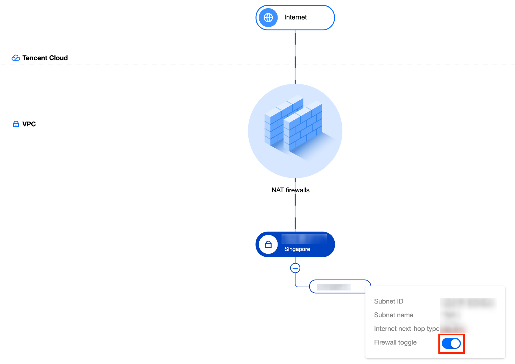 当某个 NAT 边界防火墙开关开启后,对应子网的互联网流量将经过防火墙,届时访问控制规则、入侵防御功能将对其生效,流量日志也会生成。